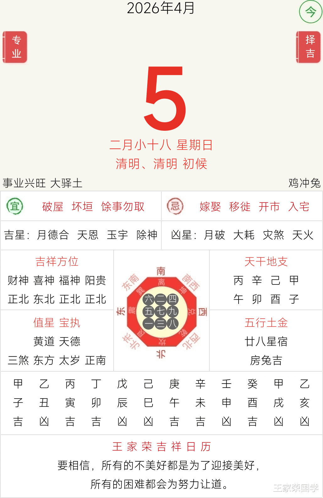每日不宜:动土 破土 纳财 掘井 挂匾 开市 伐木 交易