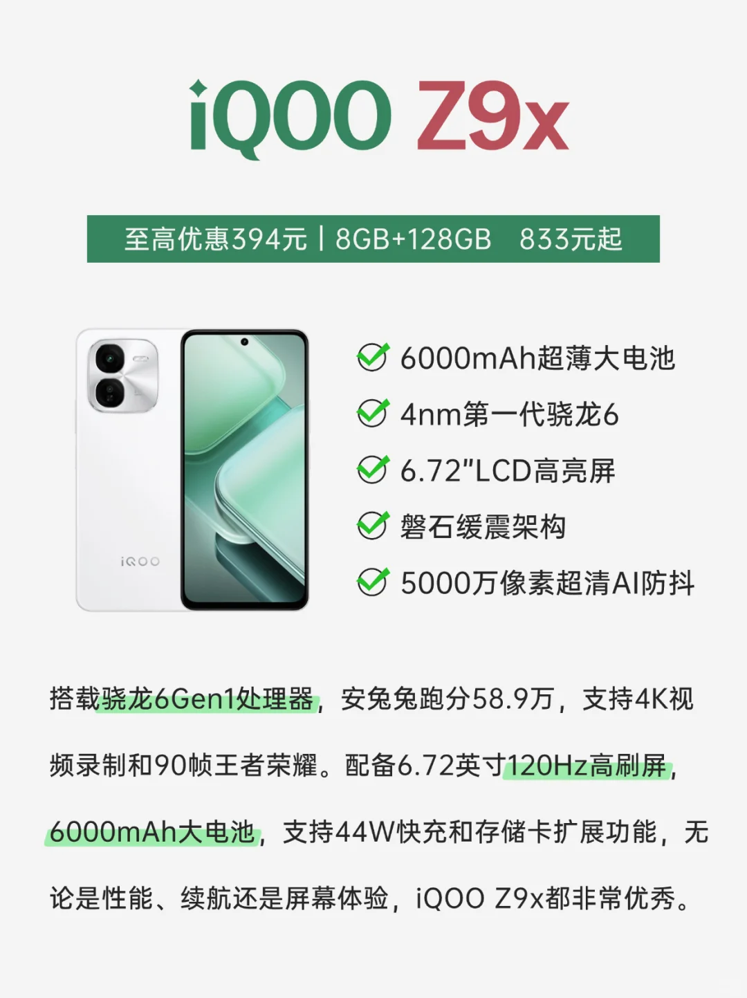 推荐4:iQOO Z9x,这台机器在国补之后来到了千元以下,真的超值,标配大电池和高刷屏,第一代骁龙6的性能日常使用也完全不是问题,甚至还支持防水,外放效果也很不错。
