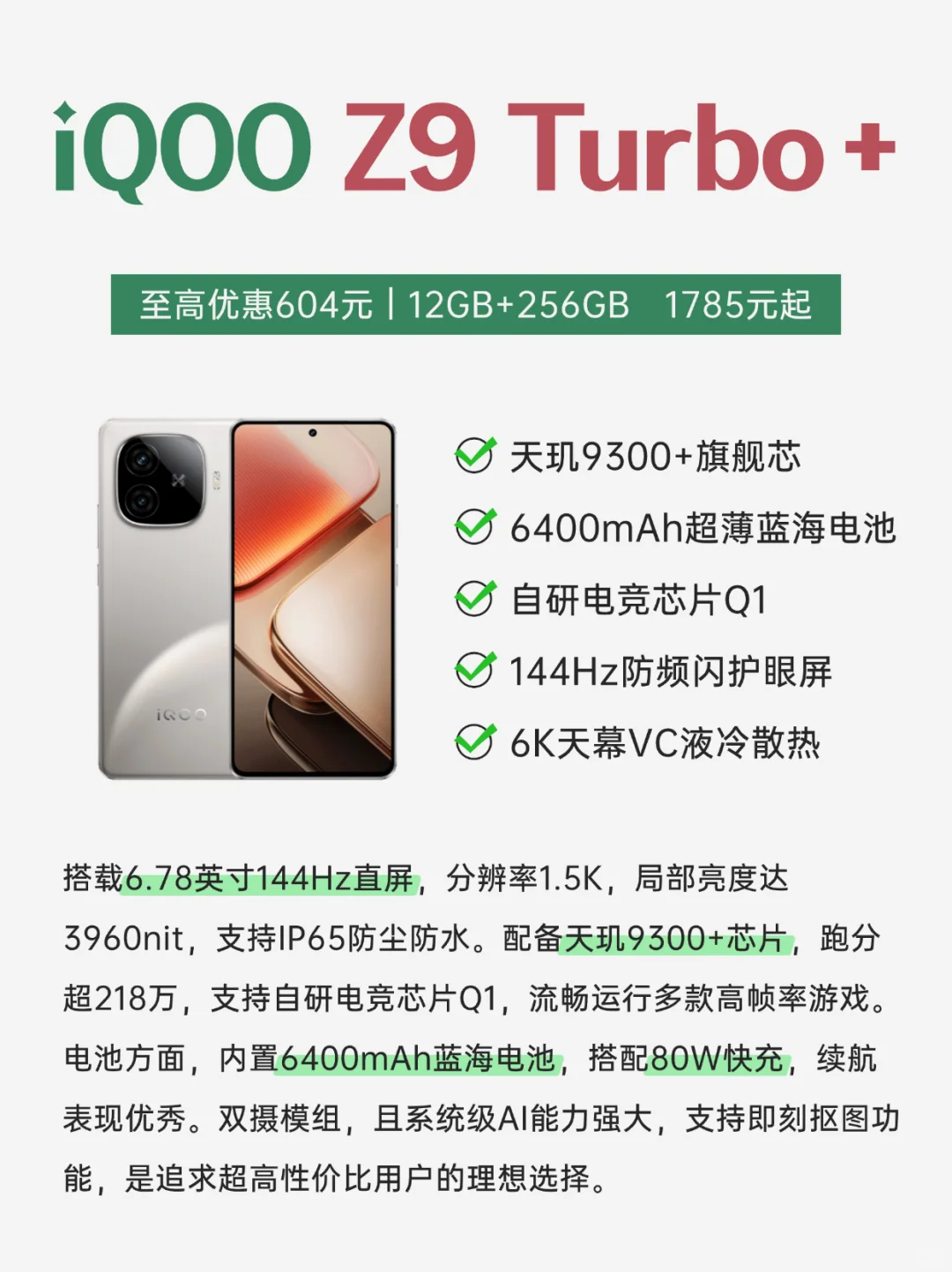推荐3:iQOO Z9 Turbo+,它的6400mAh蓝海电池续航表现很不错,同时还有Q1电竞芯片和天玑9300+处理器,国补后的价格还是蛮香的。