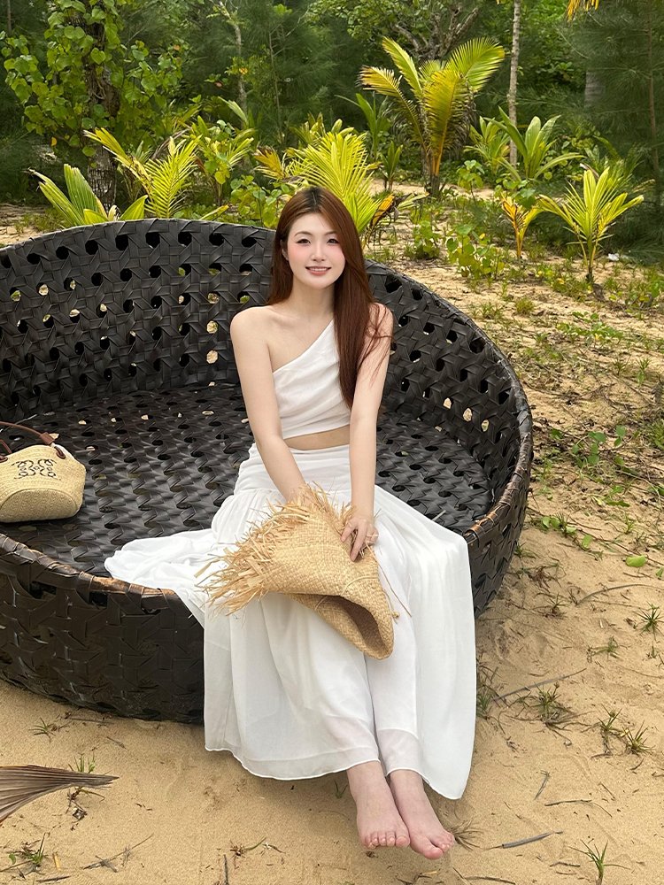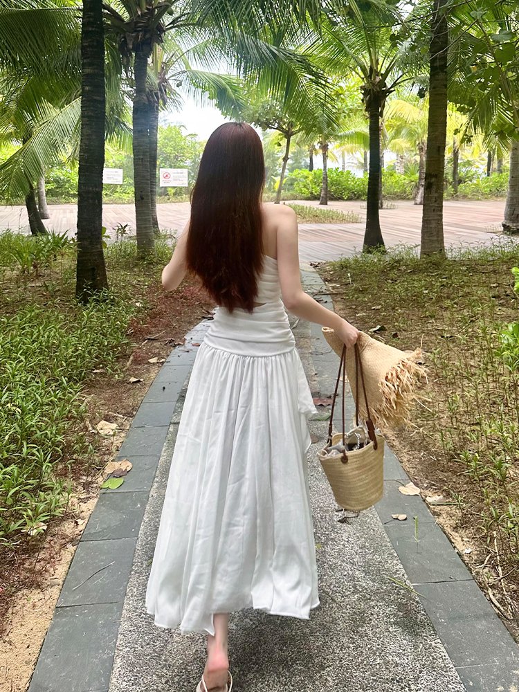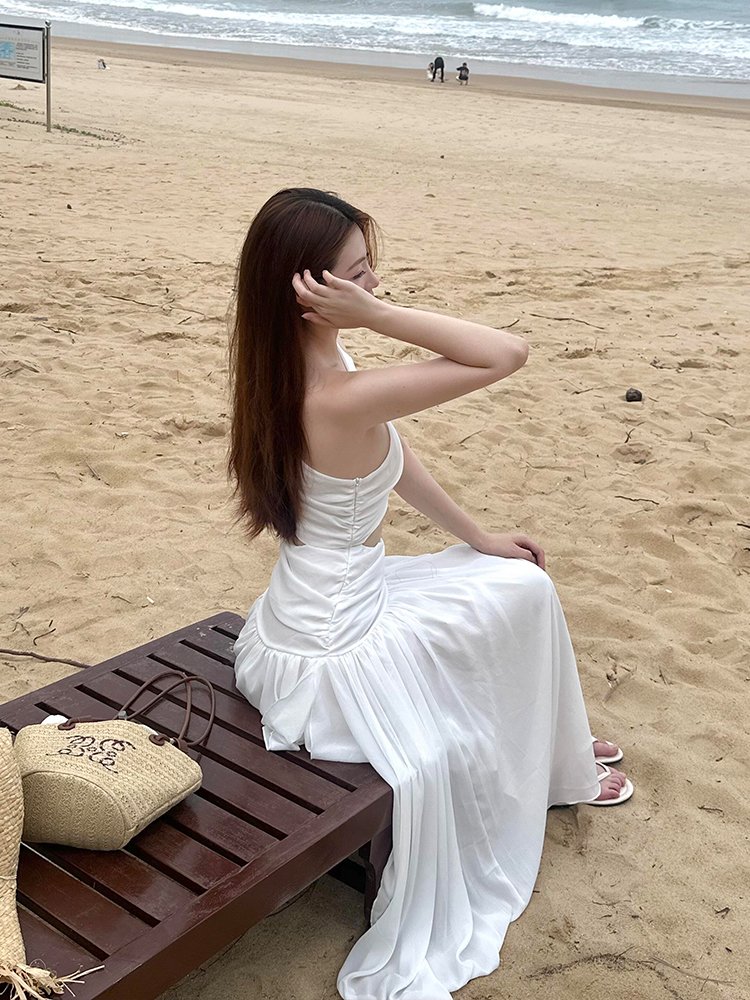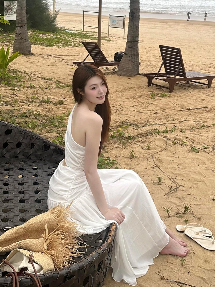 法式斜肩白色吊带连衣裙2025年新款海边度假性感纯欲晨袍生日裙子