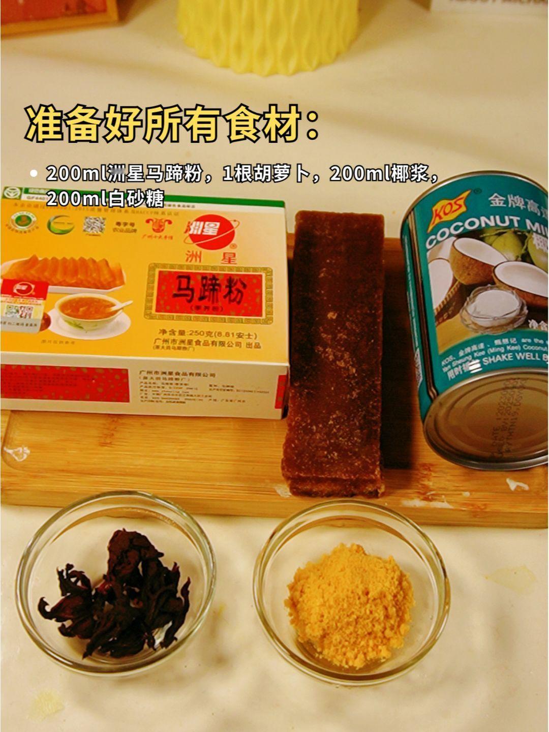 200ml洲星马蹄粉,1根胡萝卜,200ml椰浆,200ml白砂糖。