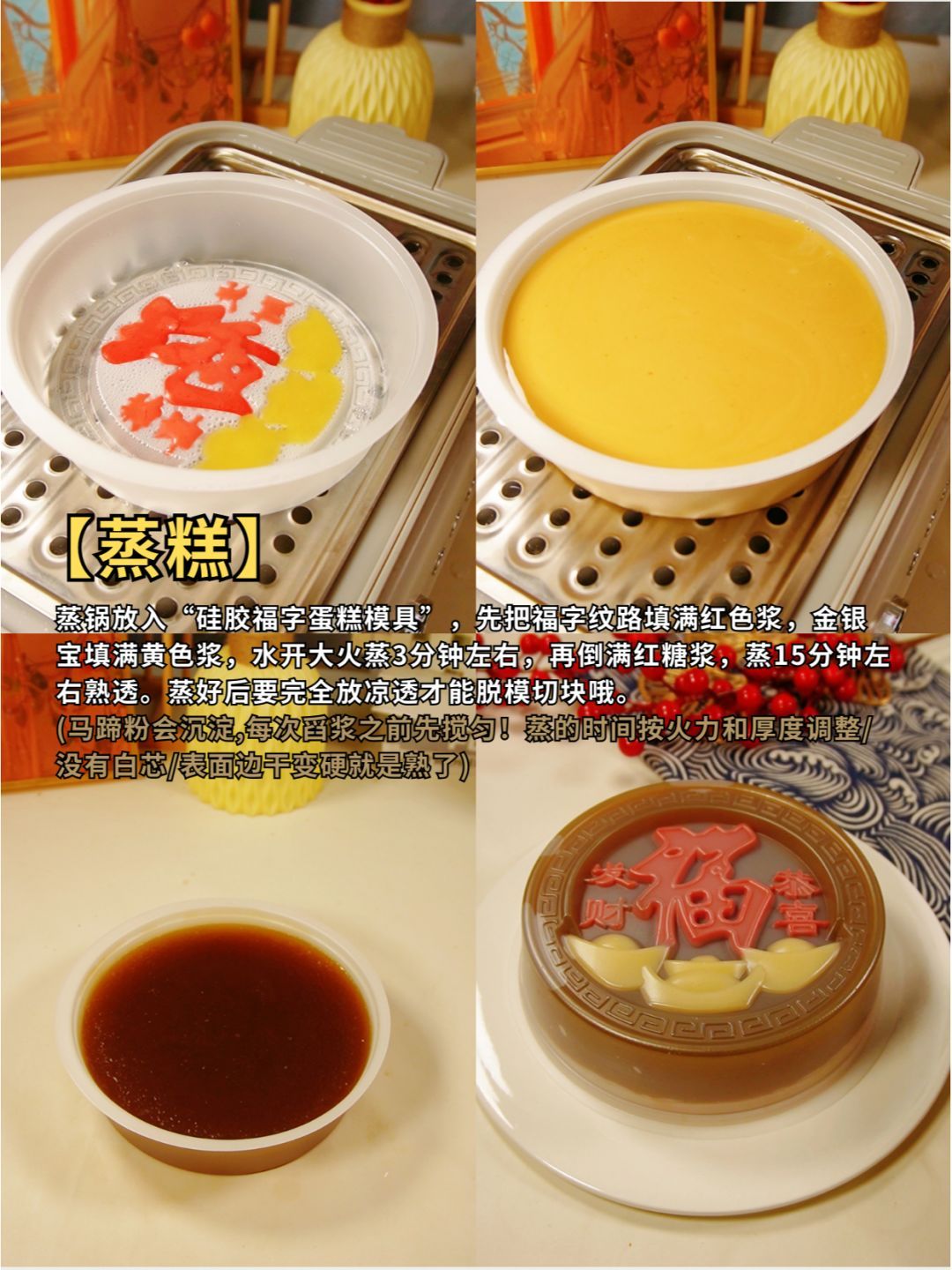 蒸锅放入“硅胶福字蛋糕模具”,先把福字纹路填满红色浆,金银宝填满黄色浆,水开大火蒸3分钟左右,再倒满红糖浆,蒸15分钟左右熟透。蒸好后要完全放凉透才能脱模切块哦。