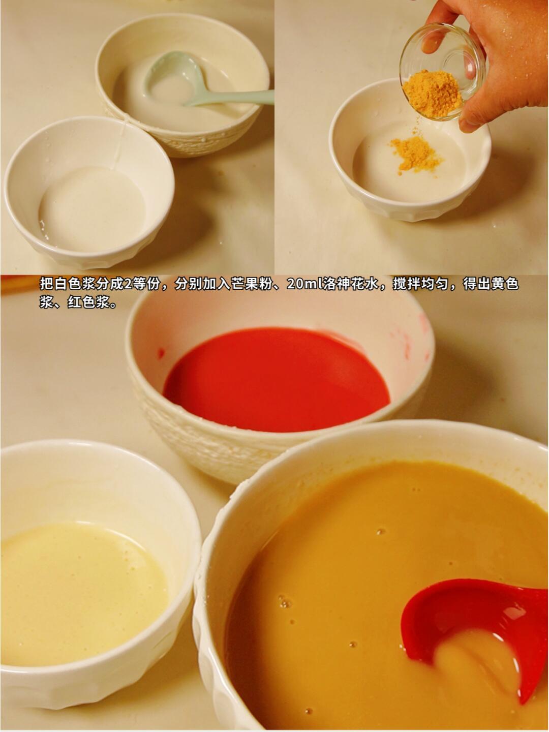 4️⃣ 把白色浆分成2等份,分别加入芒果粉、20ml洛神花水,搅拌均匀,得出黄色浆、红色浆。