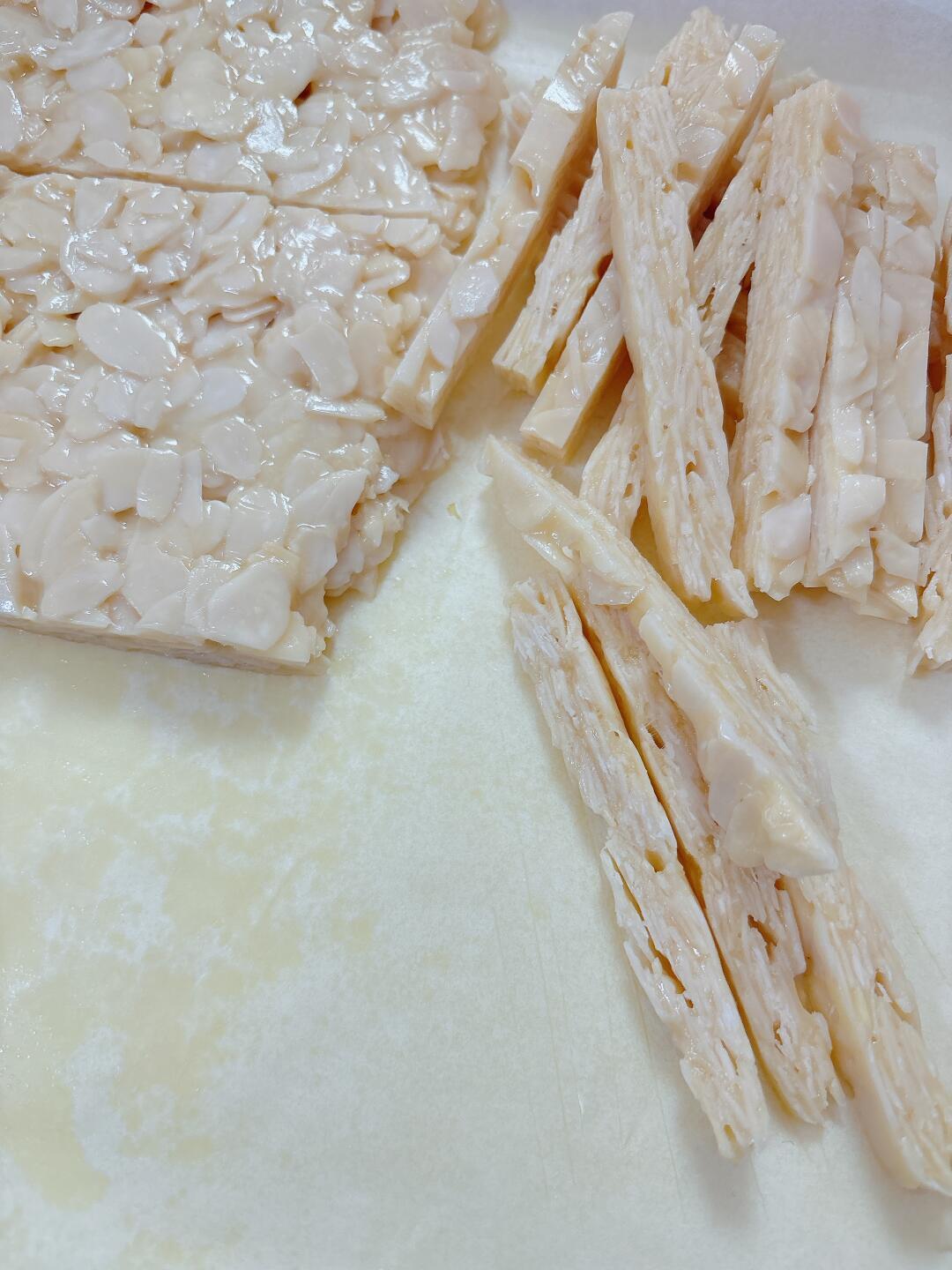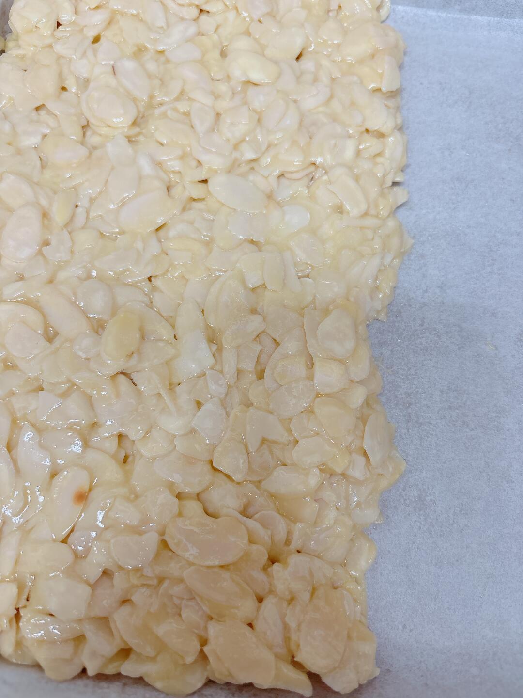 3⃣️把拌匀的杏仁片放入铺了油纸的烤盘中(或者不粘烤盘中)整形成厚约1厘米的大方块,冬天常温放凉、夏天冷藏十多分钟到凉。