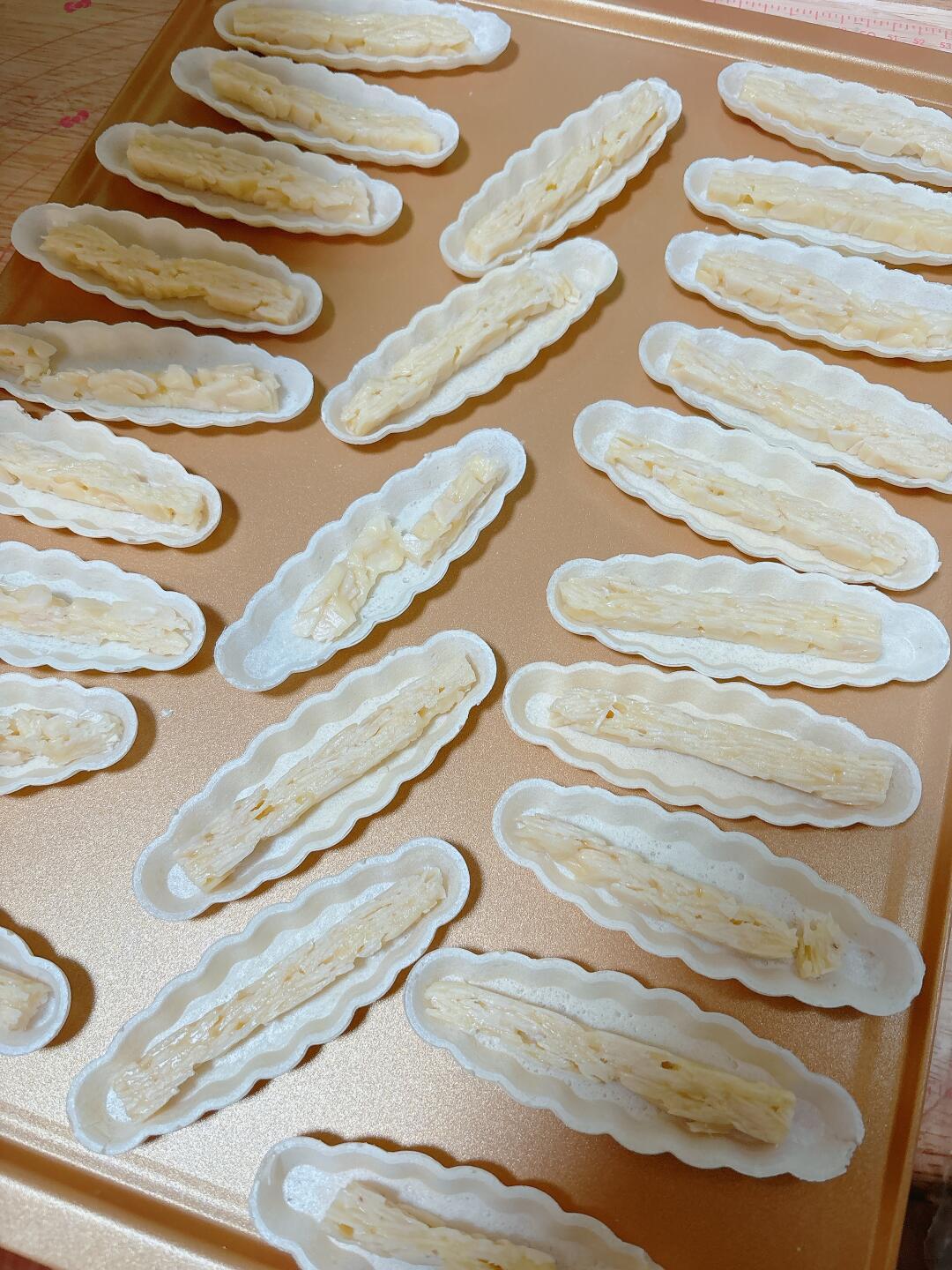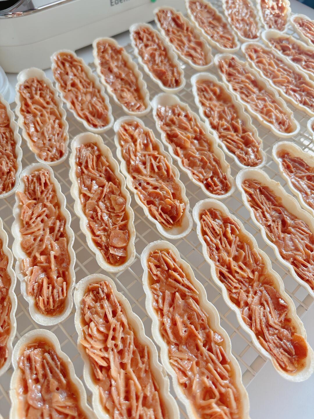 4⃣️把杏仁片切成长条状,长度跟糯米船底差不多,切面朝上放入糯米船壳中。