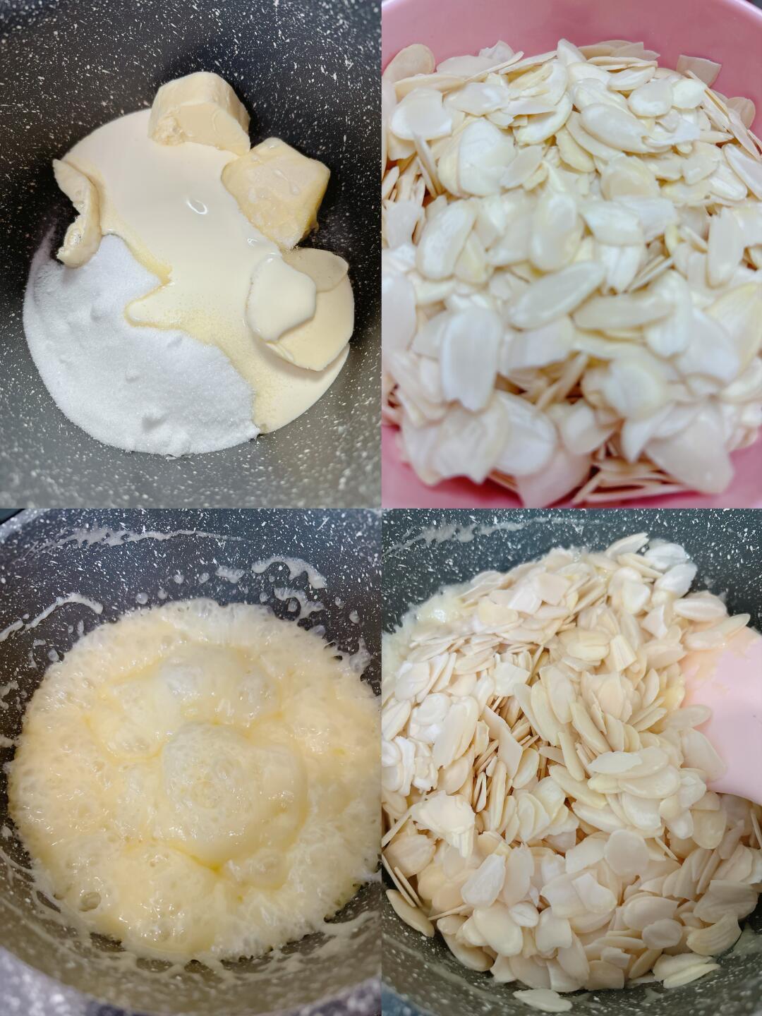 2⃣️熬到糖浆呈细泡沫状后即可关火放入杏仁片,拌匀。