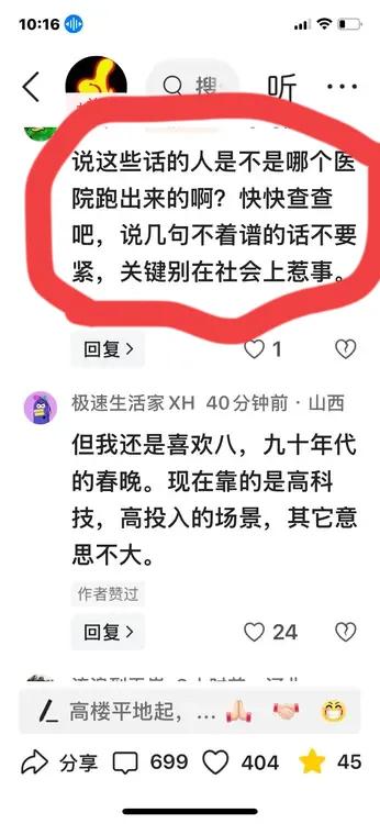看春晚我是这样过的: 虽然预想春晚不会怎么样,但还是怀着期盼的心情打开了电视机,春晚刚刚上演了一会儿。 我第一个节目看的是许仙和白娘子,是不是我也不知道,看了半天没看明白,这个节目想表达什么,我换了个台,央视八套有永不放弃电视剧续集,我连续看了两天很好,剧情,演员的表演非常到位。 可惜昨天晚上找了半天央视八套没有这部剧,又回到了春晚直播,正赶上岳云鹏和孙越的相声,大家一起说相声,我看这不是个相声,这倒像个群口剧,觉得没劲,改频道看央视九,看了一会儿心想,万一能在春晚遇到一个喜欢的节目,又回到了春晚直播,节目还是不愿意看。 开着电视机直播着春晚,我开始刷头条,发现头条上有了吐槽岳云鹏和孙越相声的帖子,基本说的一无是处。 看问题应该一分二,如果说岳云鹏和孙越说的段子不像个相声,这要怪写段子的作者,要怪导演,怪不得岳云鹏和孙越,用不着八分钟的节目,用人们的10分钟来骂他们。我写了一个帖子,这怪不得演员,要怪怪导演! 还是有些不死心,万一能遇到一个心仪的节目呢,又回到了春晚直播。 这次比较幸运,赶上武汉的分会场,热热闹闹,乱乱哄哄,想干嘛不知道,后来我想可能是导演为了烘托节日的气氛,红红火火! 像我这样人的水平欣赏不了这种节目,换频道央视五,乒乓球决赛,看了一会儿,好像原来看过。又回到春晚直播,演员没有熟悉的,节目千篇一律没有什么创新,看央视十,看了一会儿还是不死心,又回到了央视春晚直播,哎呀,这回彻底失望了,干脆关机,准备睡觉。 一晚上没看到一个喜欢的节目,我心想这不是人家导演演员的事,这是咱多少年来没跟上形势,春晚节目的水平越来越高,自己老了欣赏水平越来越差,所以拉的距离越来越大! 被时代所淘汰了! 刚刚看了一个帖子,说今年的春晚是最好的一届春晚,每个节目水平都非常高,都受到观众的喜爱! 我更心灰意冷了,活着还有什么意思,连个春晚都看不懂! 不过看了网友的留言,我心里还有些安慰: 有一个网友说:说这些话的人是不是哪个医院跑出来的啊?快快查查吧,说几句不着谱的话不要紧,关键别在社会上惹事。 还有一个网友说:已经记不得有多少年没看春晚了,昨晚满怀期望的打开,5分钟后败兴失望的关闭! 原来和我水平差不多的大有人在!
