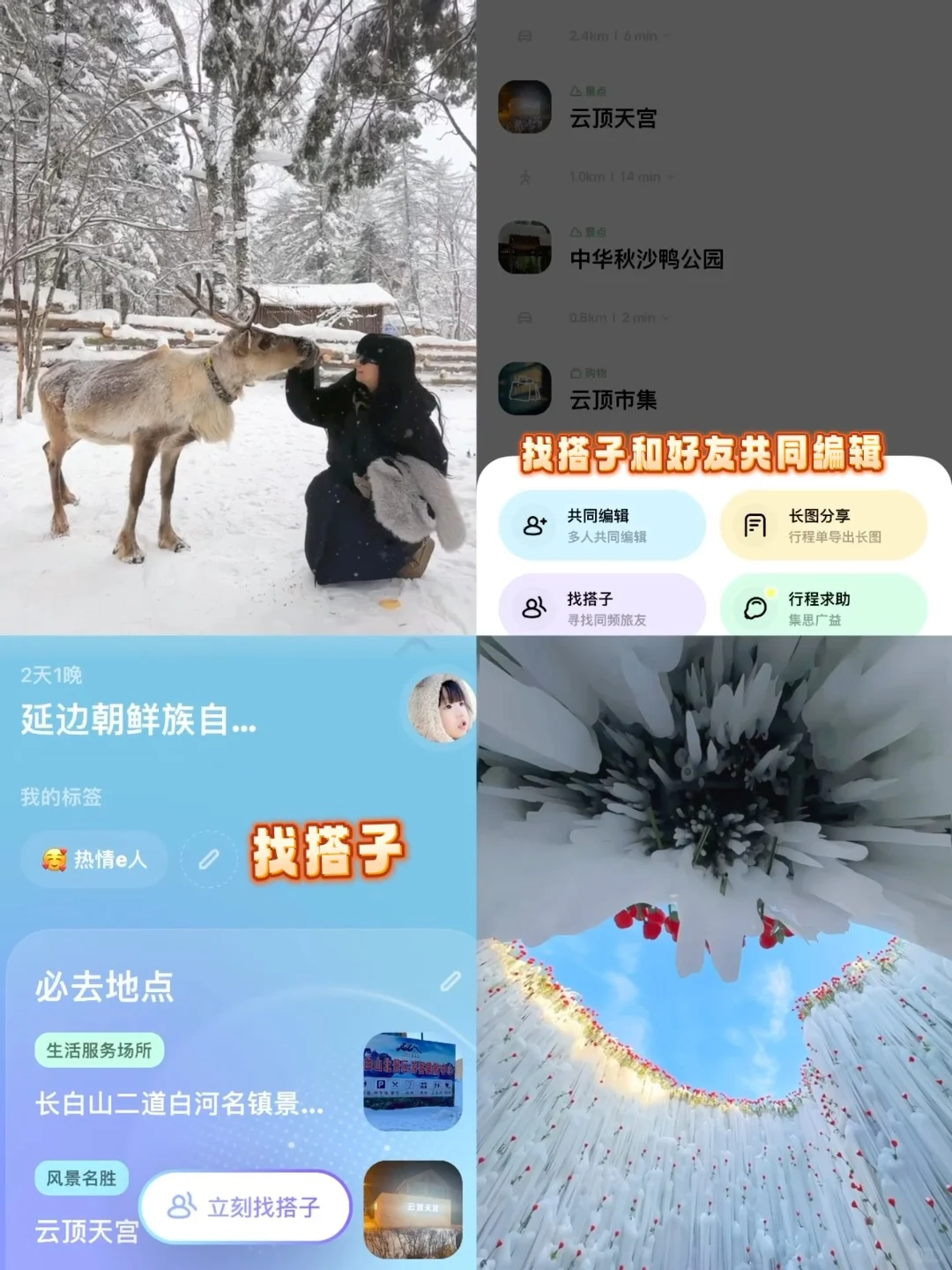 1⃣️雪绒花驯鹿园:定位“雪绒花”。有驯鹿园、雪地摩托、雪圈、冰瀑布同时有咖啡店、乌拉火锅🦌