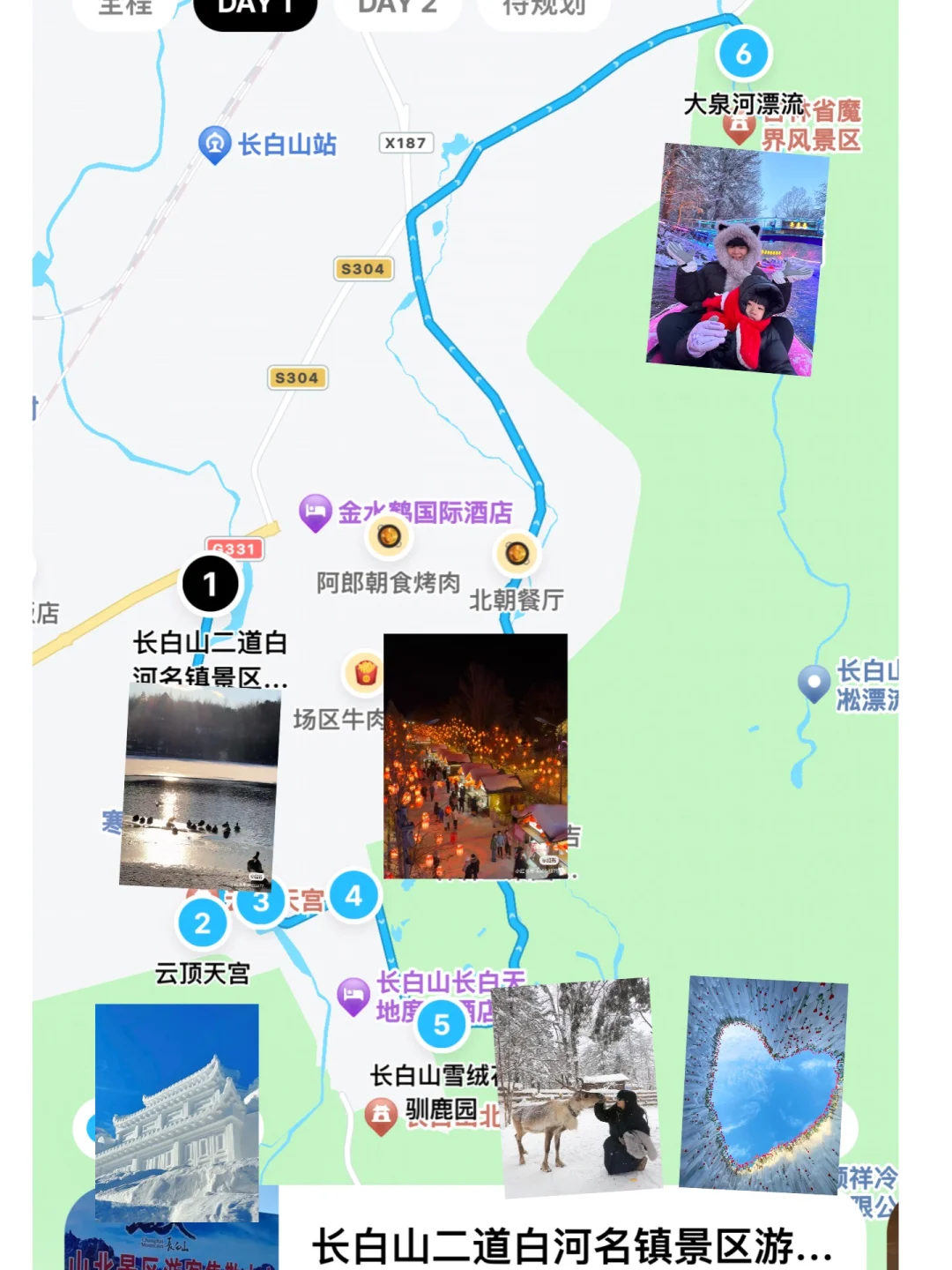 2⃣️二道白河镇👉雪绒花-冰瀑布-中华秋沙鸭公园-云顶天宫-云顶市集👉白河镇吃饭