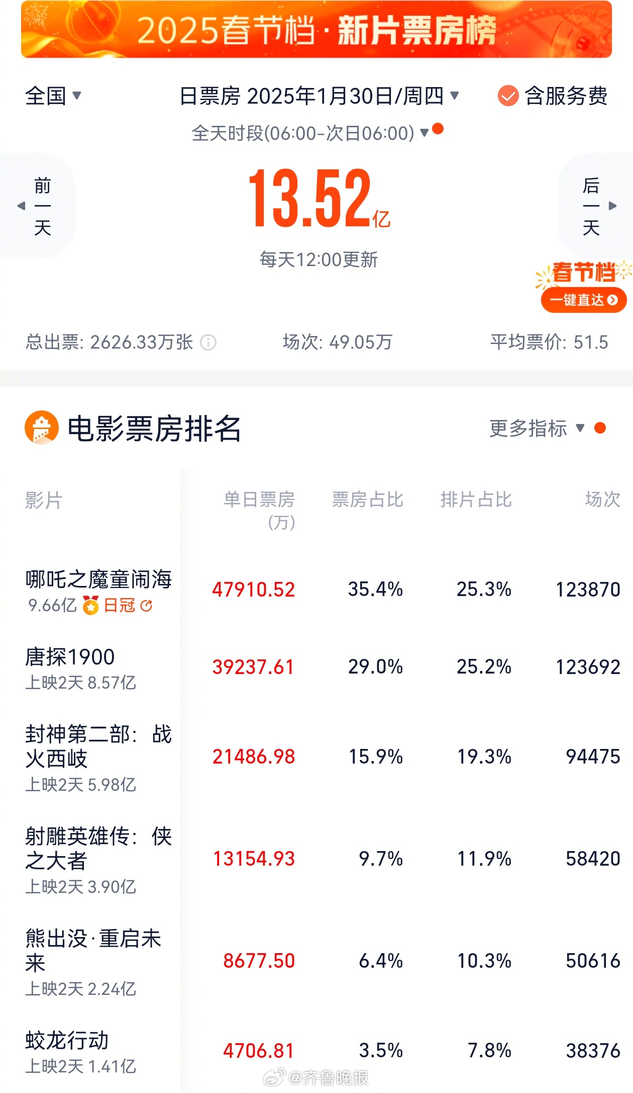 【#春节档单日电影票房连续3天破10亿#】据网络平台数据,截至1月31日17时48分,2025大年初三单日票房破11亿,春节档已连续三天单日大盘票房破10亿。大年初一,共有六部国产新片集中上映,包括《封神第二部:战火西岐》《哪吒之魔童闹海》《唐探1900》《蛟龙行动》《熊出没·重启未来》《射雕英雄传:侠之大者》。#哪吒2或将进入影史票房前三# #票房#