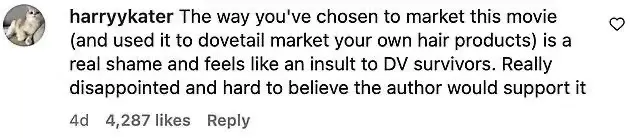 “你选择宣传这部电影的方式,和利用电影宣传你护发产品的做法真的很无耻,感觉像是对家暴幸存者的羞辱。非常的失望,不敢相信原作者会支持这种行为。”