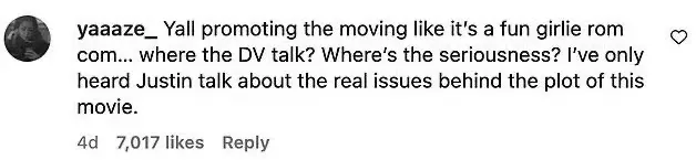 “这是我见过的最麻木不仁的举动。这部电影是关于家庭暴力的,……电影宣传的像是女孩儿们在拉家常,家暴的对话在哪儿?严肃在哪儿?整个宣传季我只听见过贾斯汀在认真讨论这个电影的情节。”