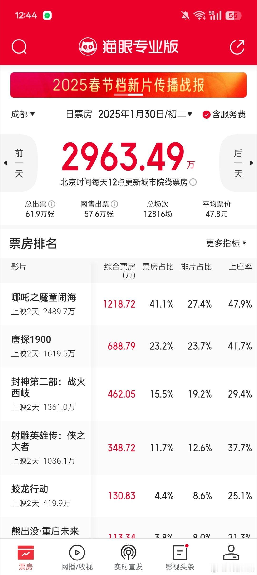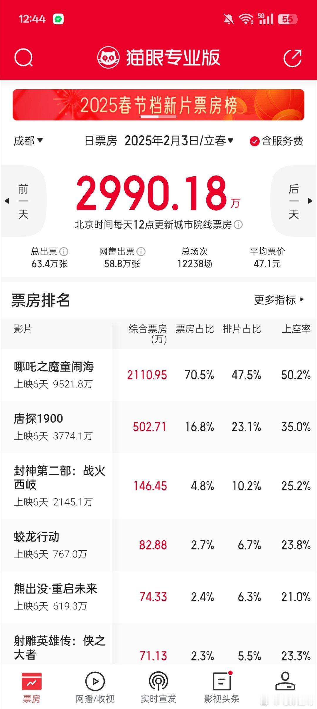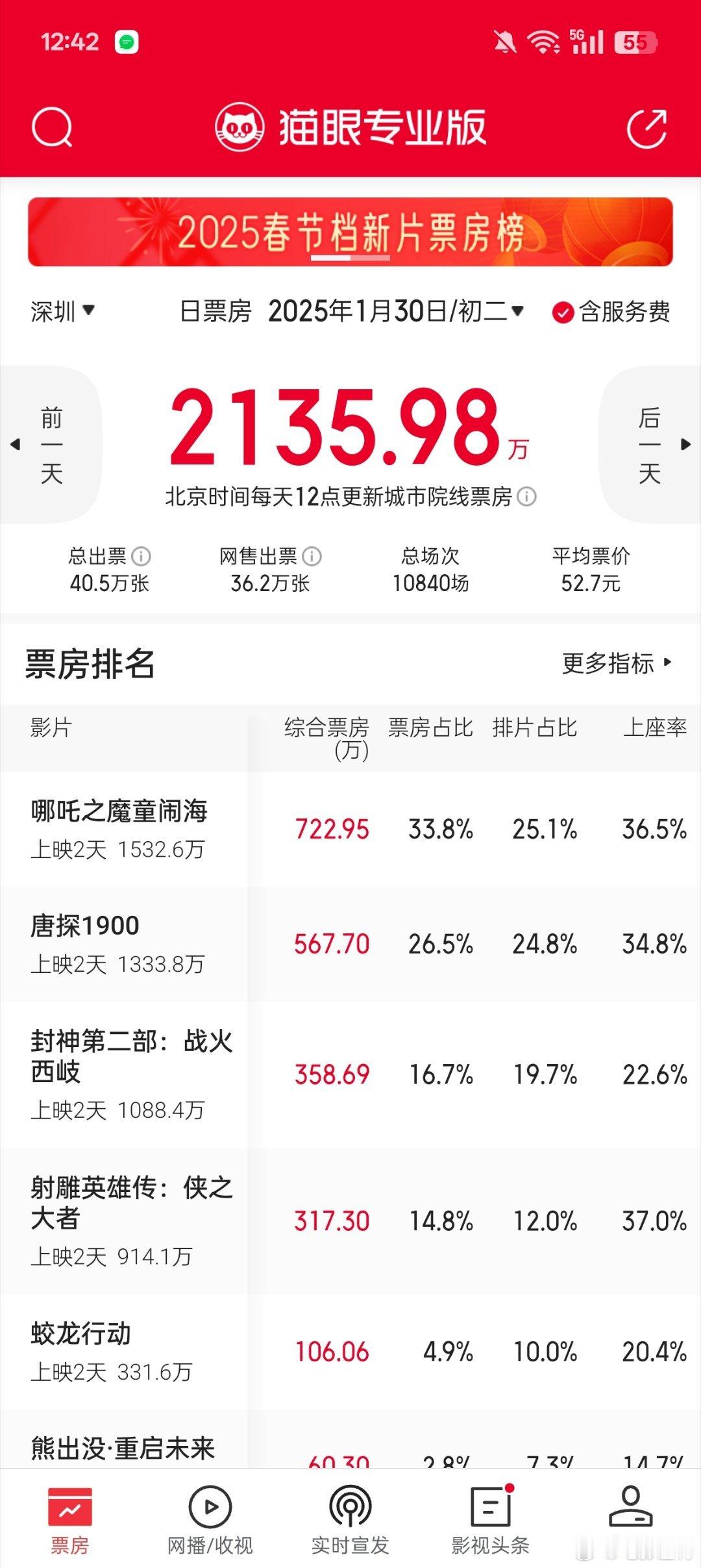 蛇来运转春节档 听听温特怎么说 返程回流再加上《哪吒2》票房逆增长。昨天广深成都武汉等地票房比年初二还高。