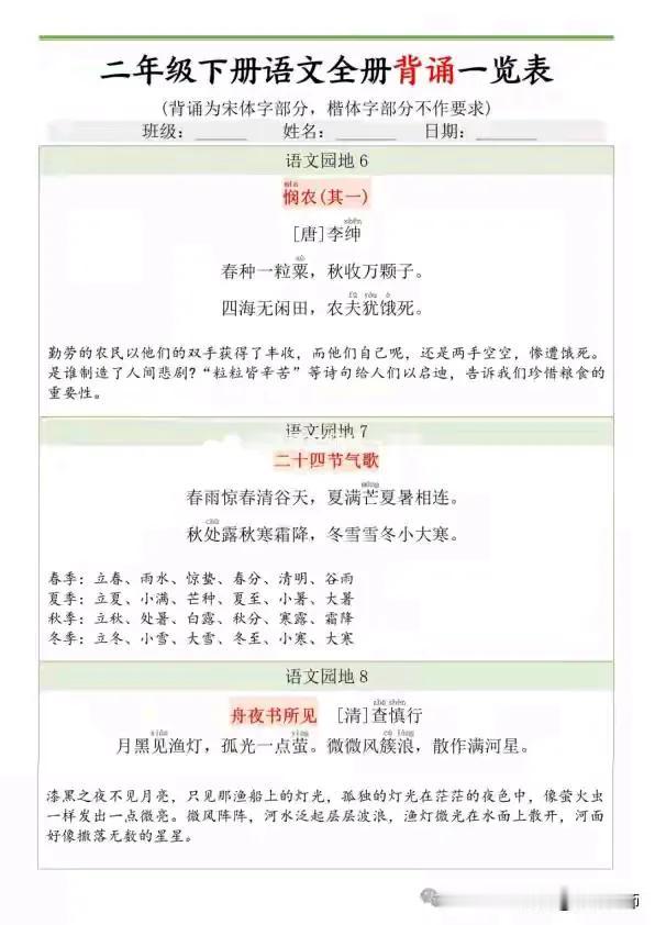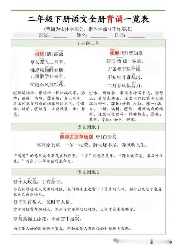 二年级语文下册必背内容闯关表真的很实用。它涵盖好多重要内容,像《村居》《咏柳》这