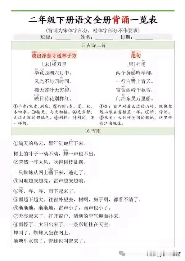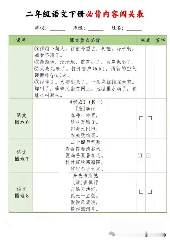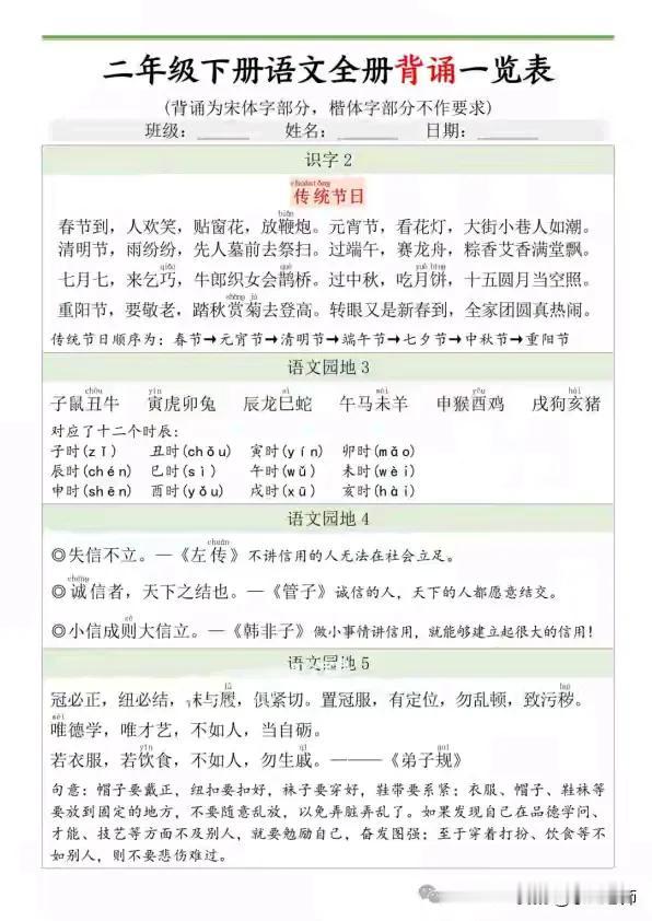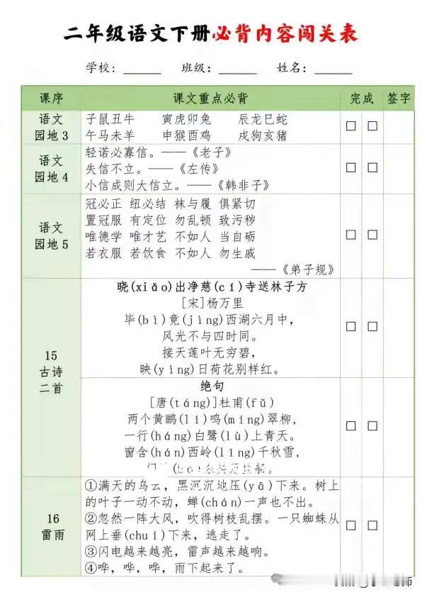 二年级语文下册必背内容闯关表真的很实用。它涵盖好多重要内容,像《村居》《咏柳》这些古诗,不但有原文,还有注释、译文。里面的名言警句、传统节日知识等也很全。这表对学生帮助超大。就拿古诗背诵来说,按顺序排列,从《村居》到《绝句》,方便系统记忆。而且它还有“是否过关”和“检查人”栏,便于自我评估。知识拓展方面,语文园地的日积月累内容,像谚语、诚信名言、《弟子规》节选等,能拓宽知识面,积累语言素材,在预习复习时也能提高课堂学习的主动性。