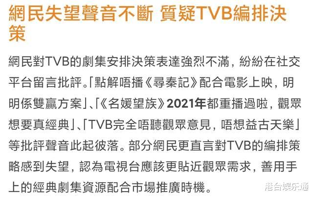《新假期》还表示,TVB的播出安排激怒了很多本地网友,大家纷纷怒斥TVB拒绝双赢方案,不配合《寻秦记》电影版上映,不支持本地制作,诸如“TVB完全不听观众意见,不想便宜古天乐”、“《名媛望族》2021年就重播过来,观众想要真经典”等评论比比皆是。