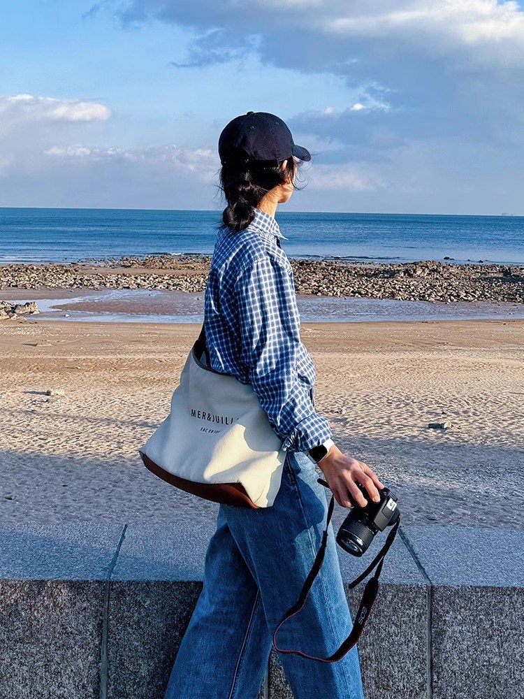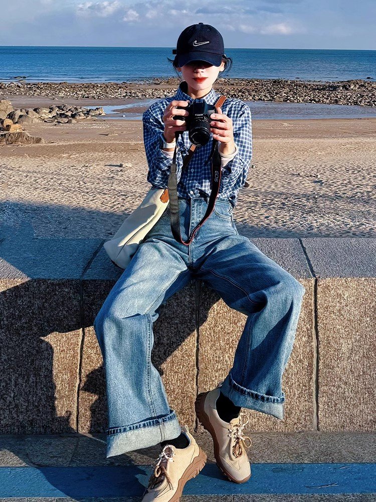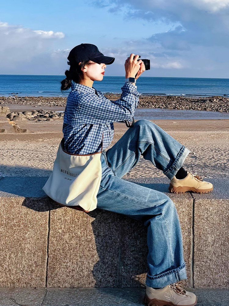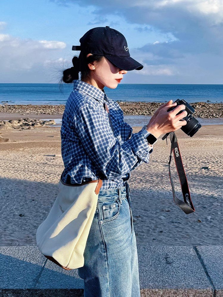蓝色格子polo领长袖衬衫上衣女春秋季小