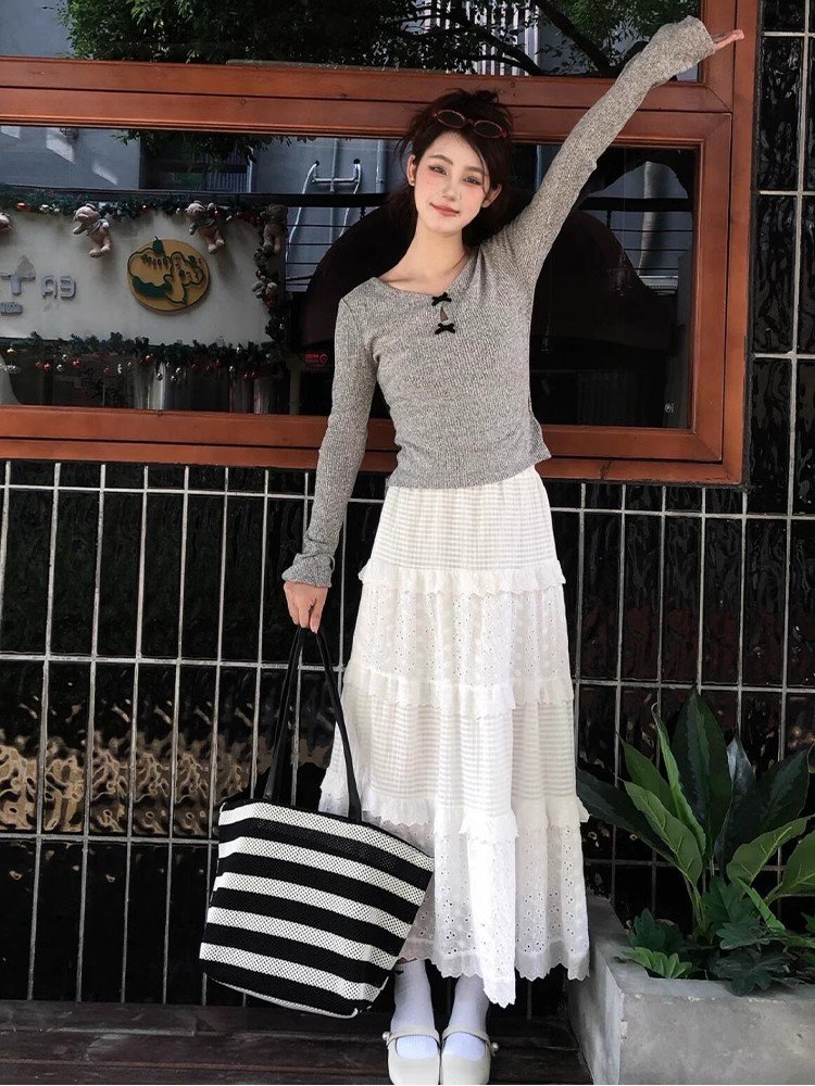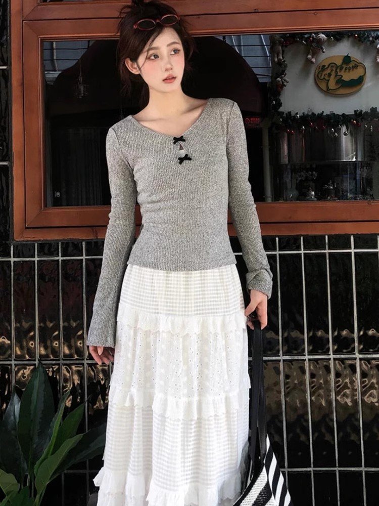 早春韩系内搭灰色v领长袖t恤小个子修身短