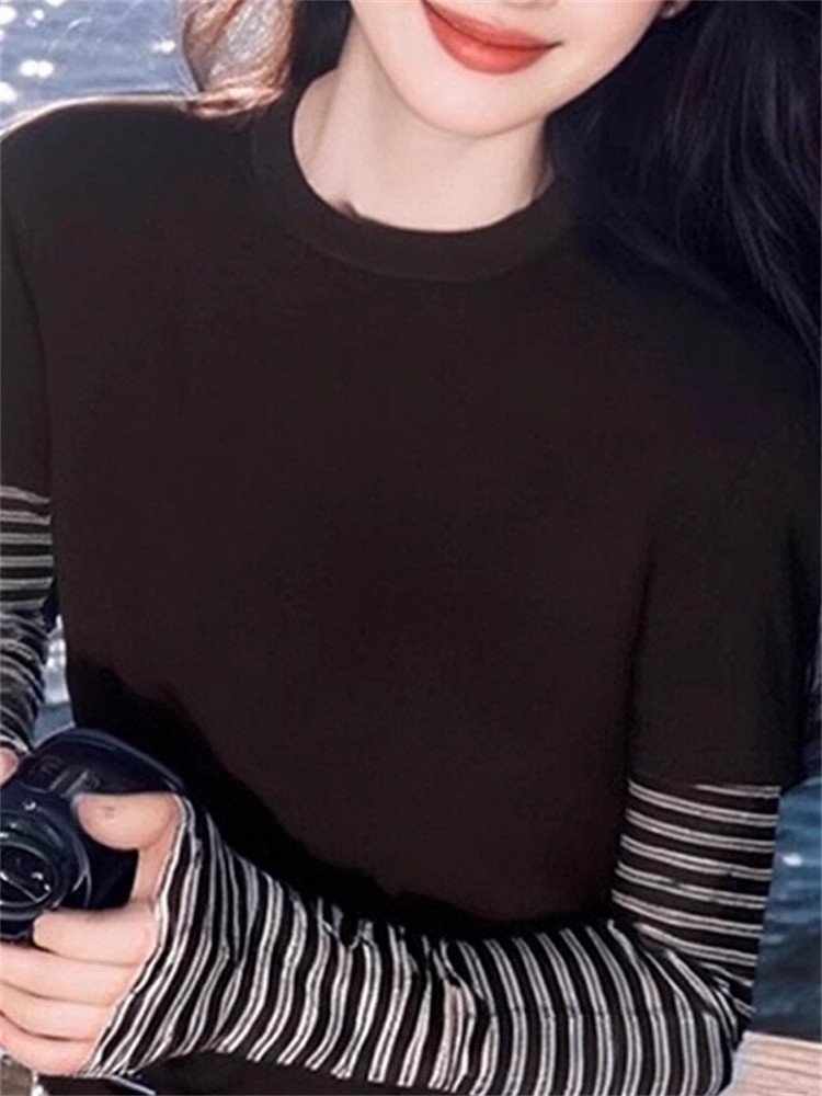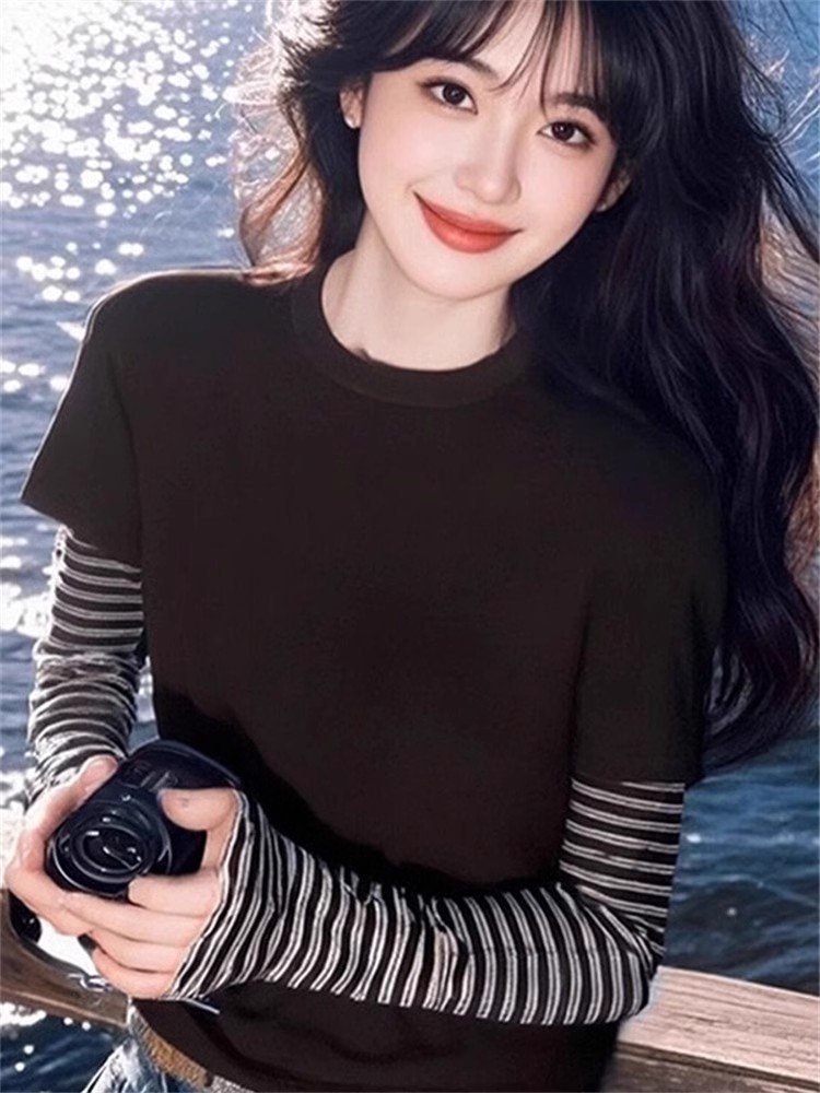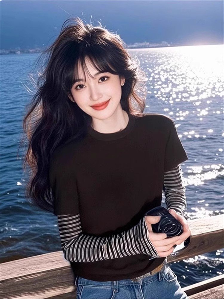 美式复古黑色假两件长袖正肩t恤女春秋季修