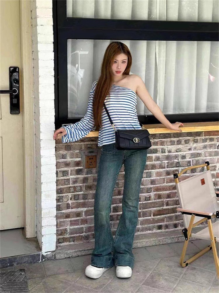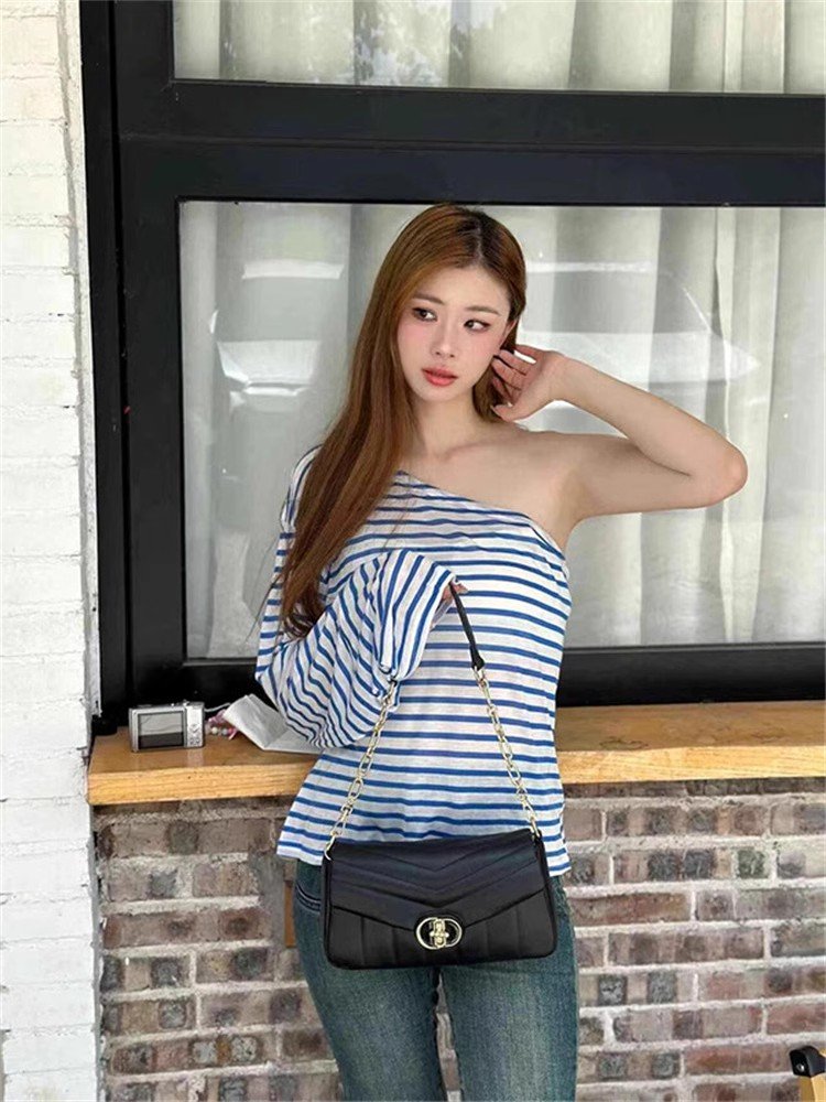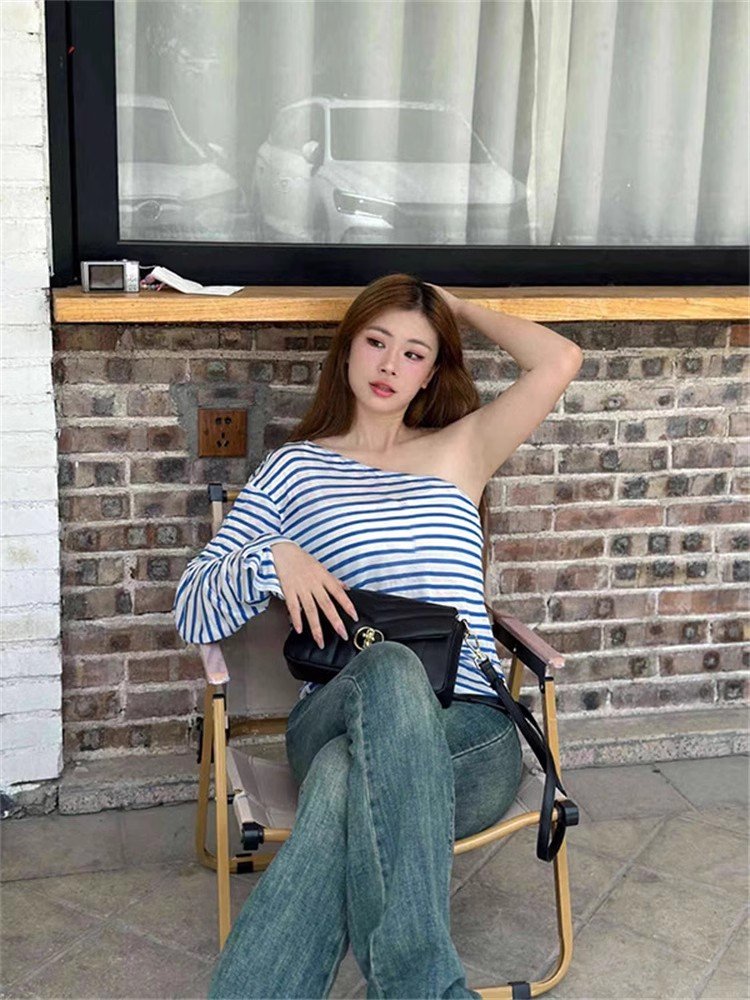 辣妹内搭蓝白条纹斜肩长袖t恤女春秋宽松短