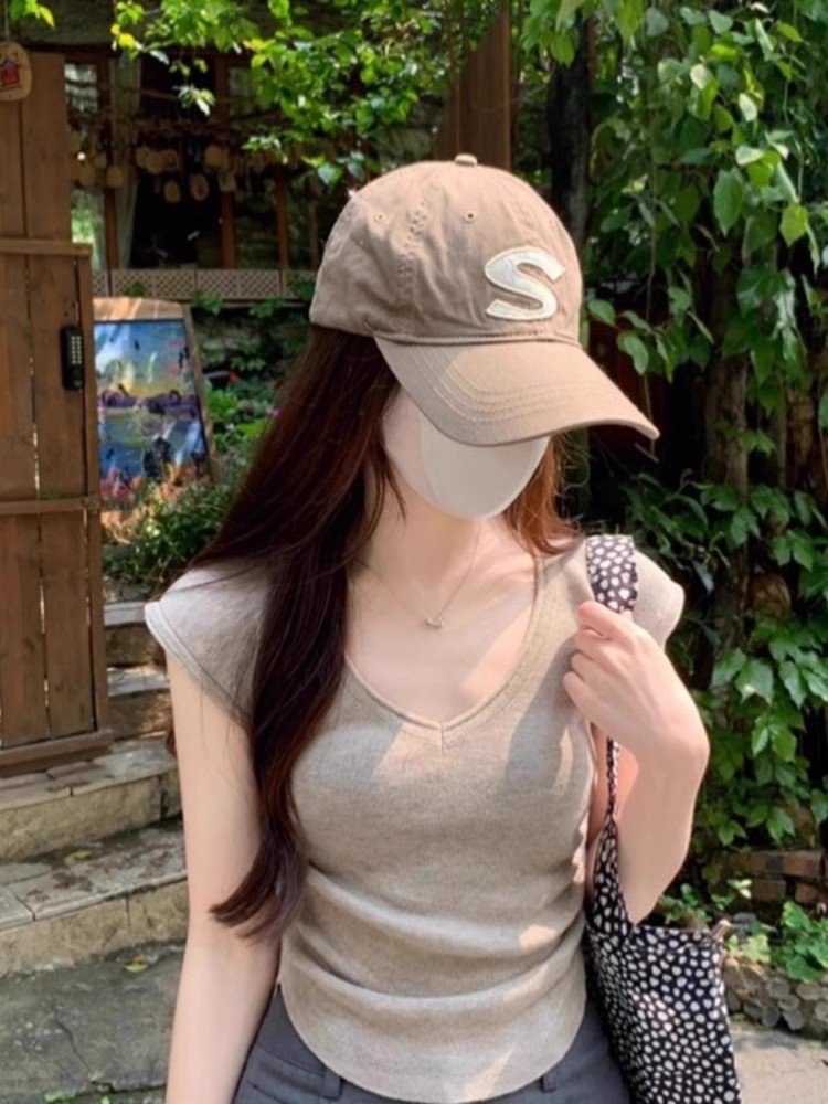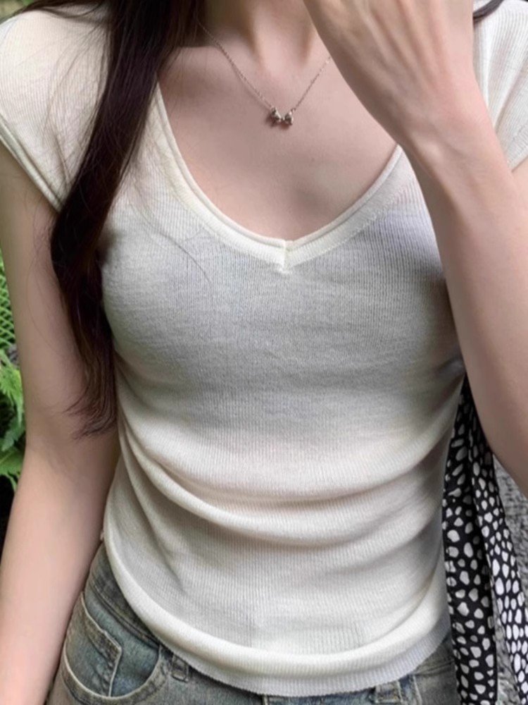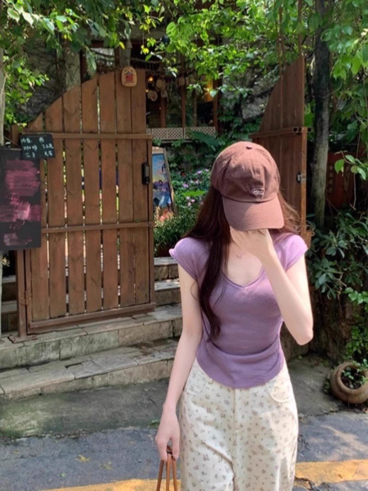 辣妹紫色v领小飞袖短袖t恤不规则修身短款