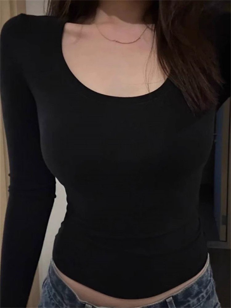 性感辣妹白色u领长袖正肩t恤女春秋小个子