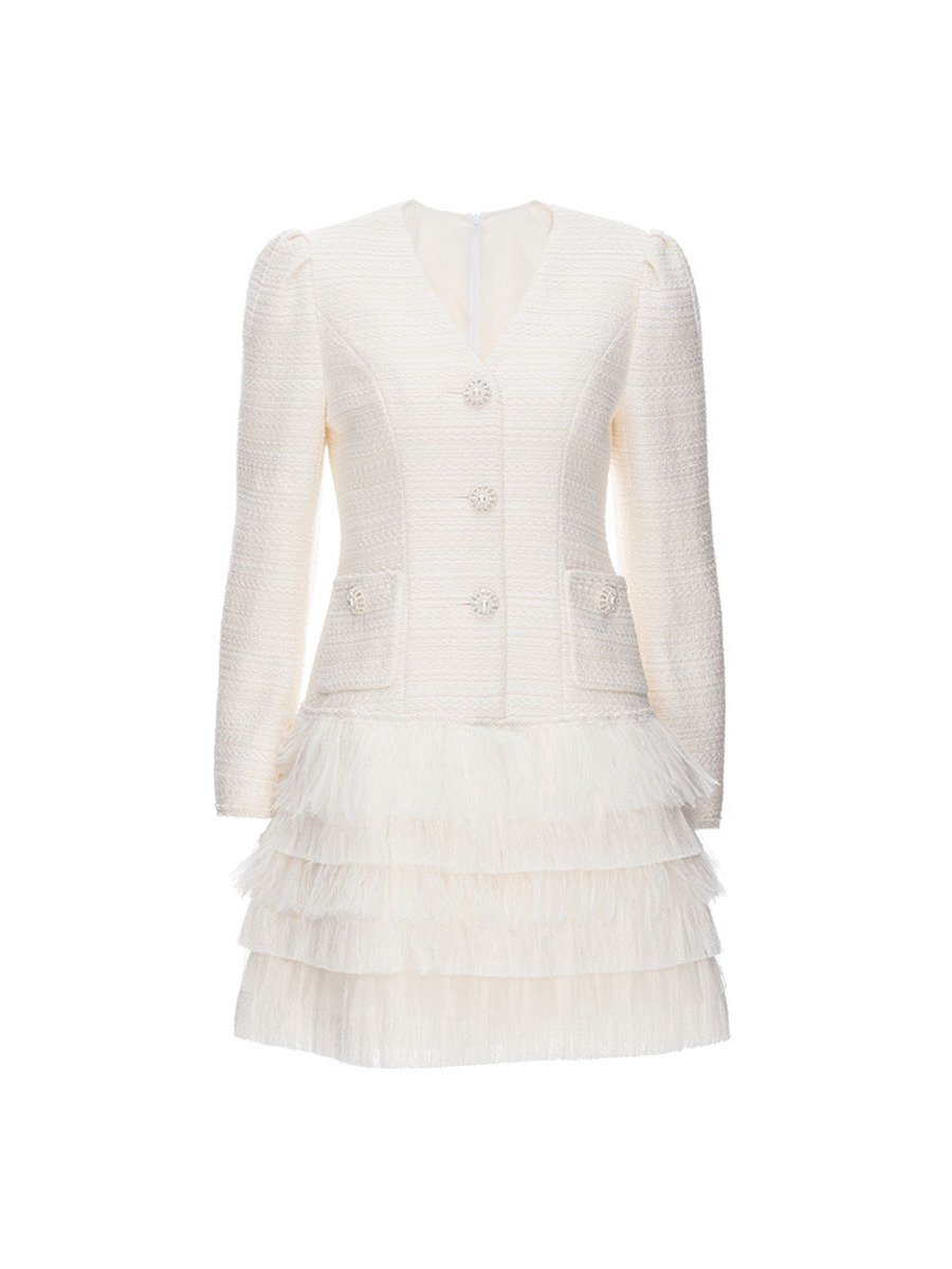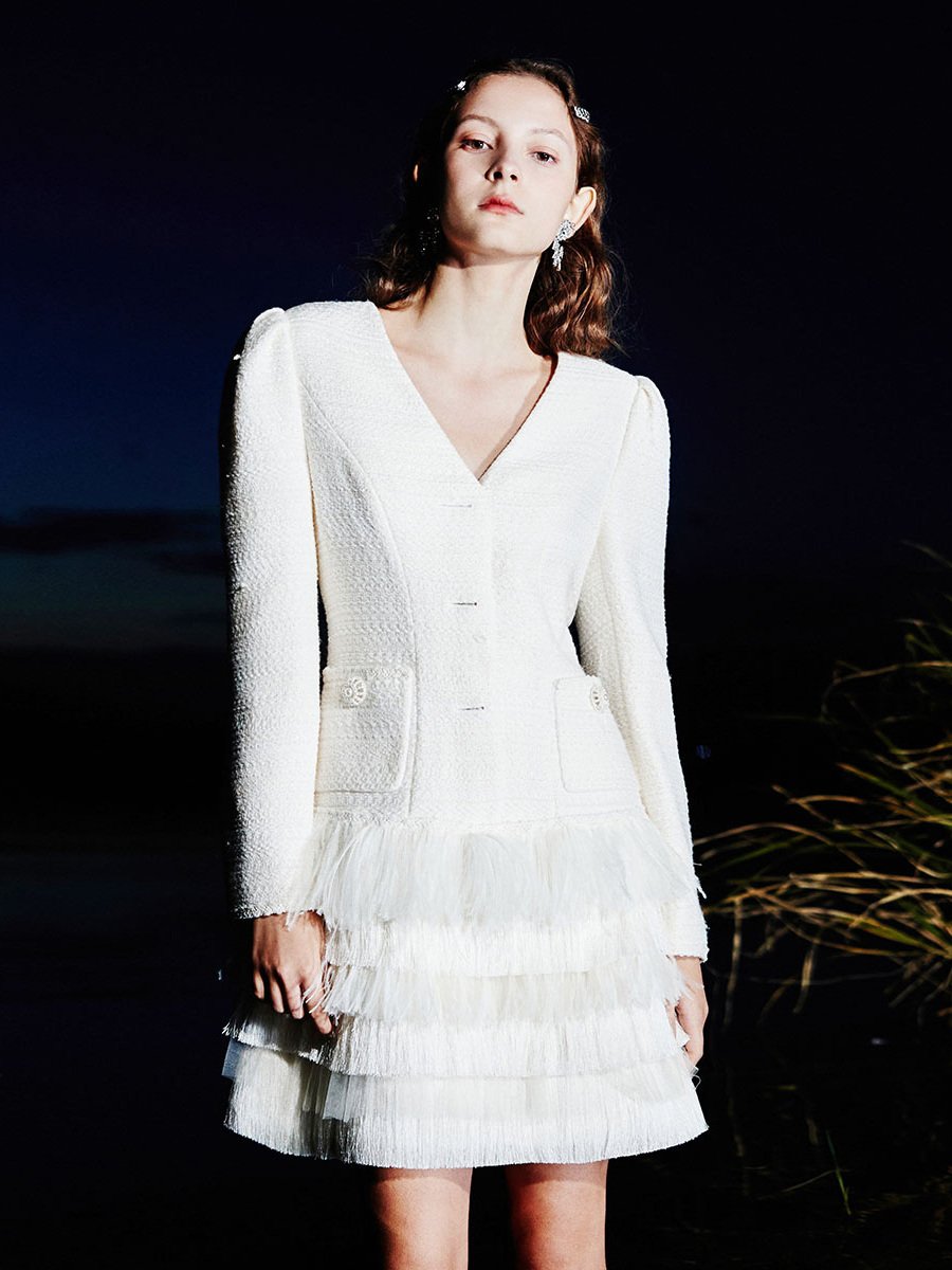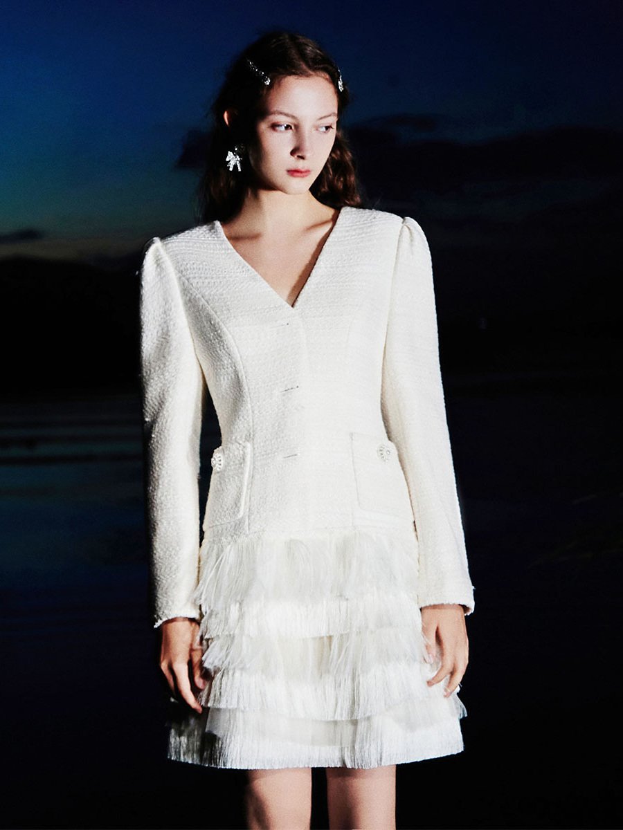哥文花园编织羊毛呢流苏蛋糕小香风连衣裙