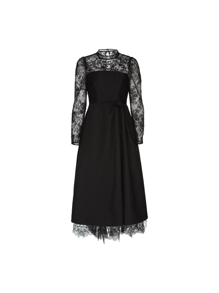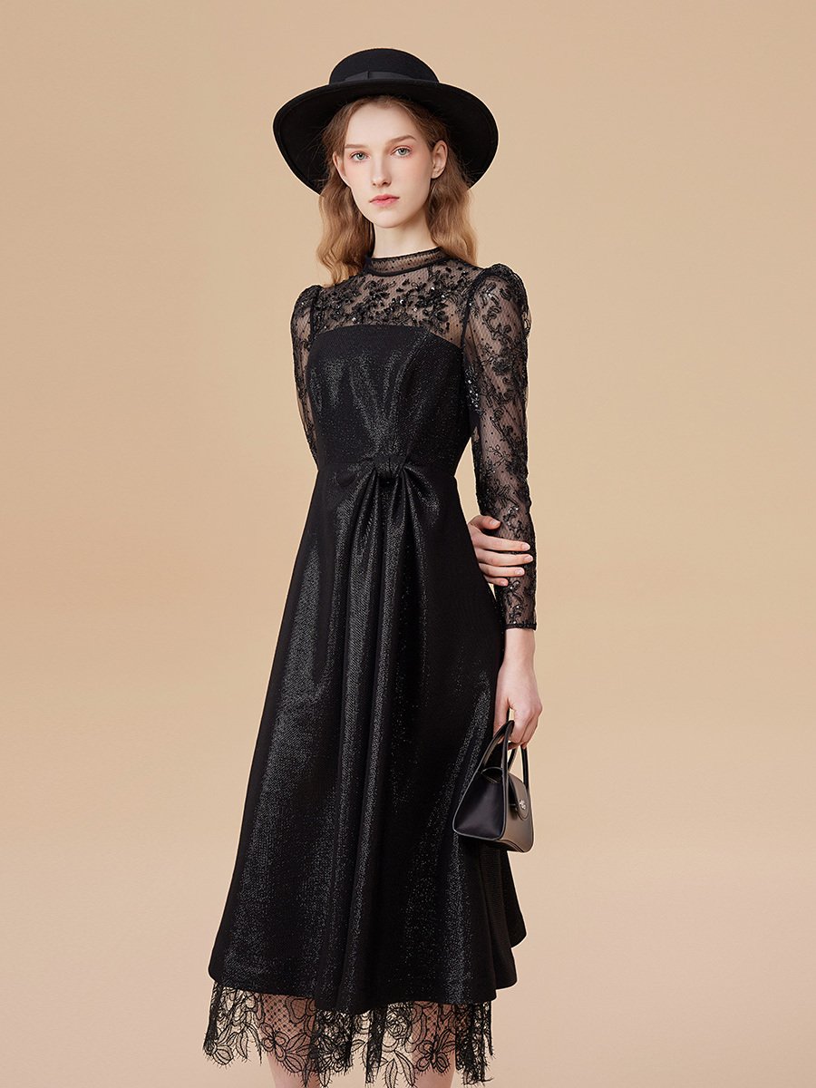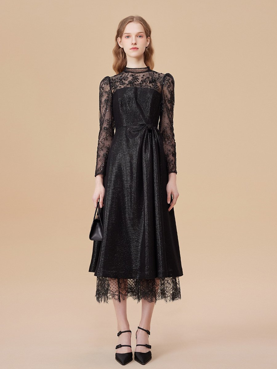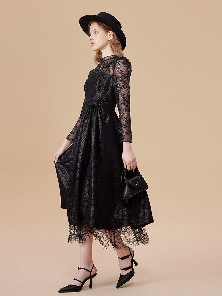 哥文花园蝴蝶结黑色珠片蕾丝连衣裙