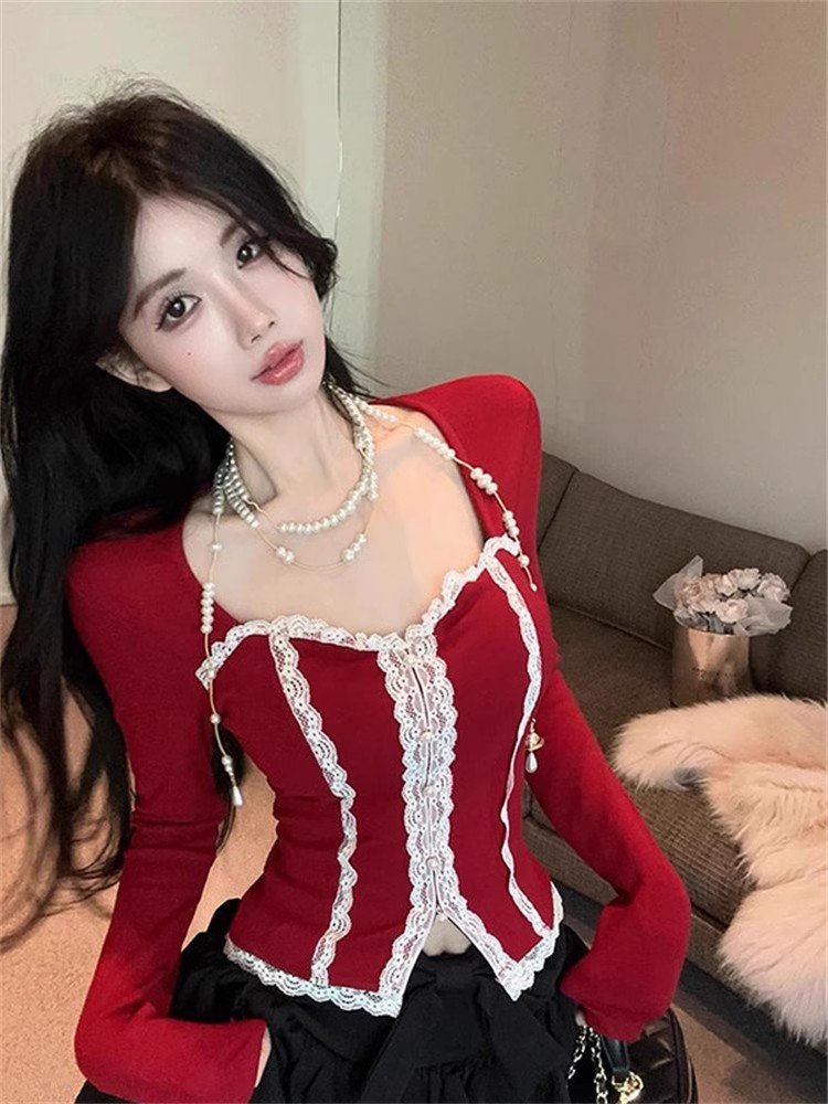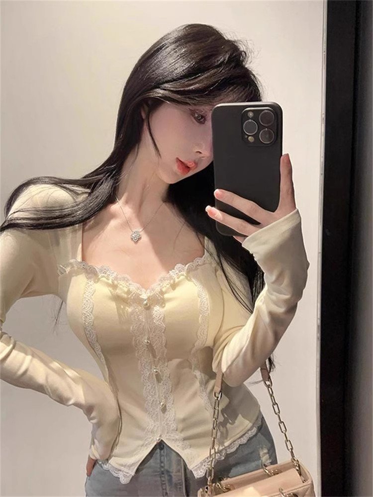 纯欲内搭杏色蕾丝方领长袖t恤女春秋季不规