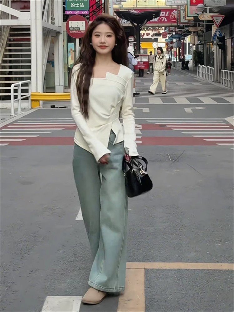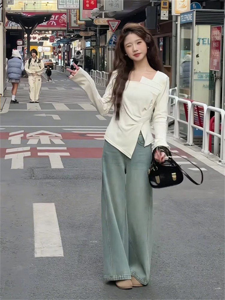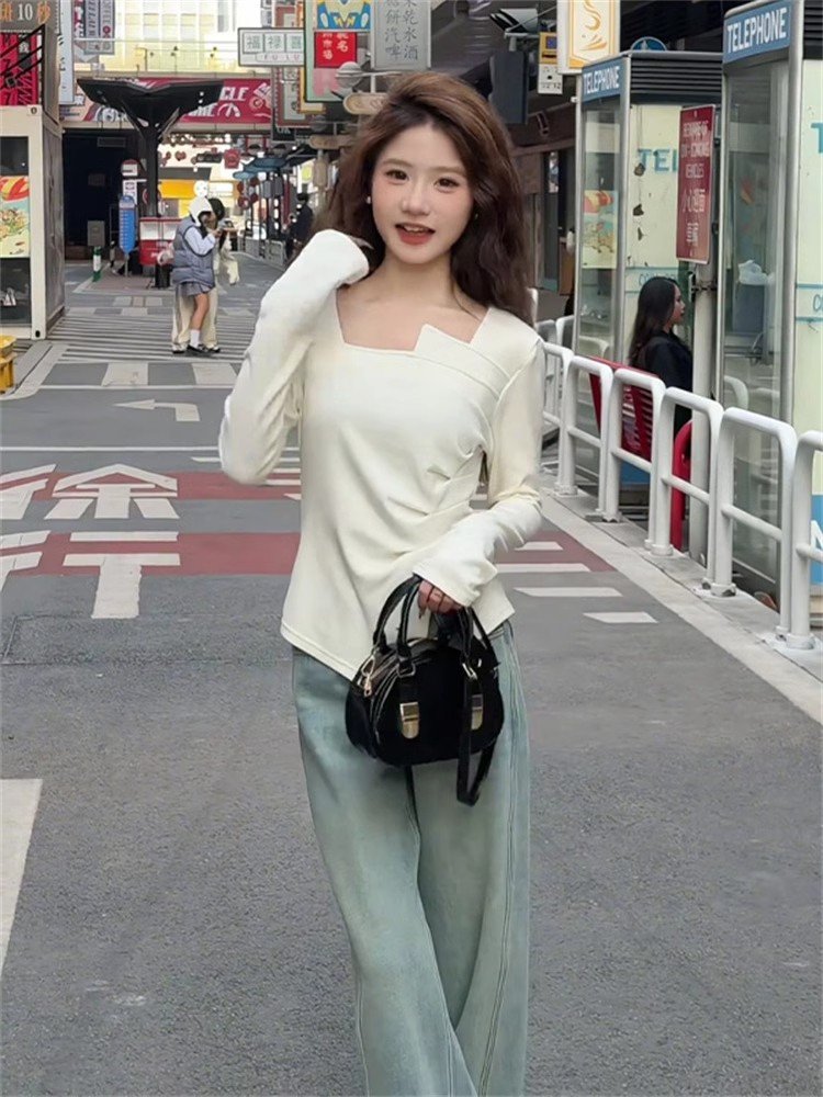 法式内搭白色不规则长袖正肩t恤女早春打底