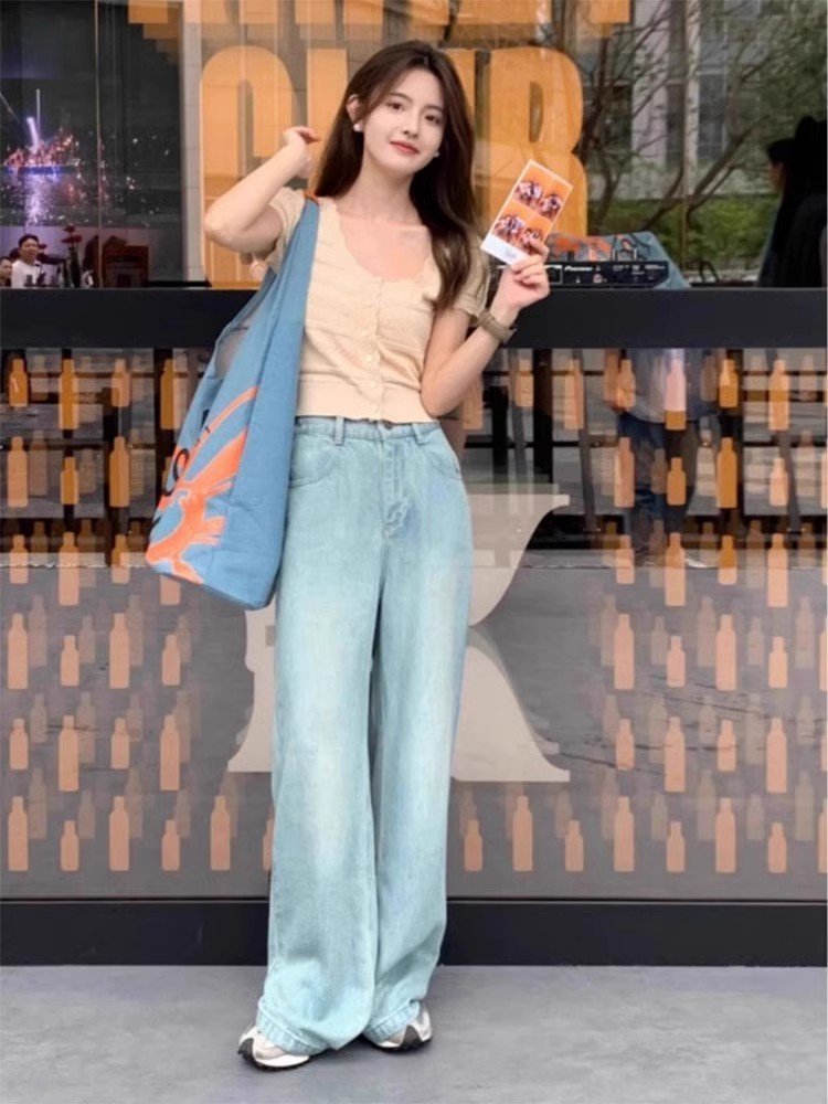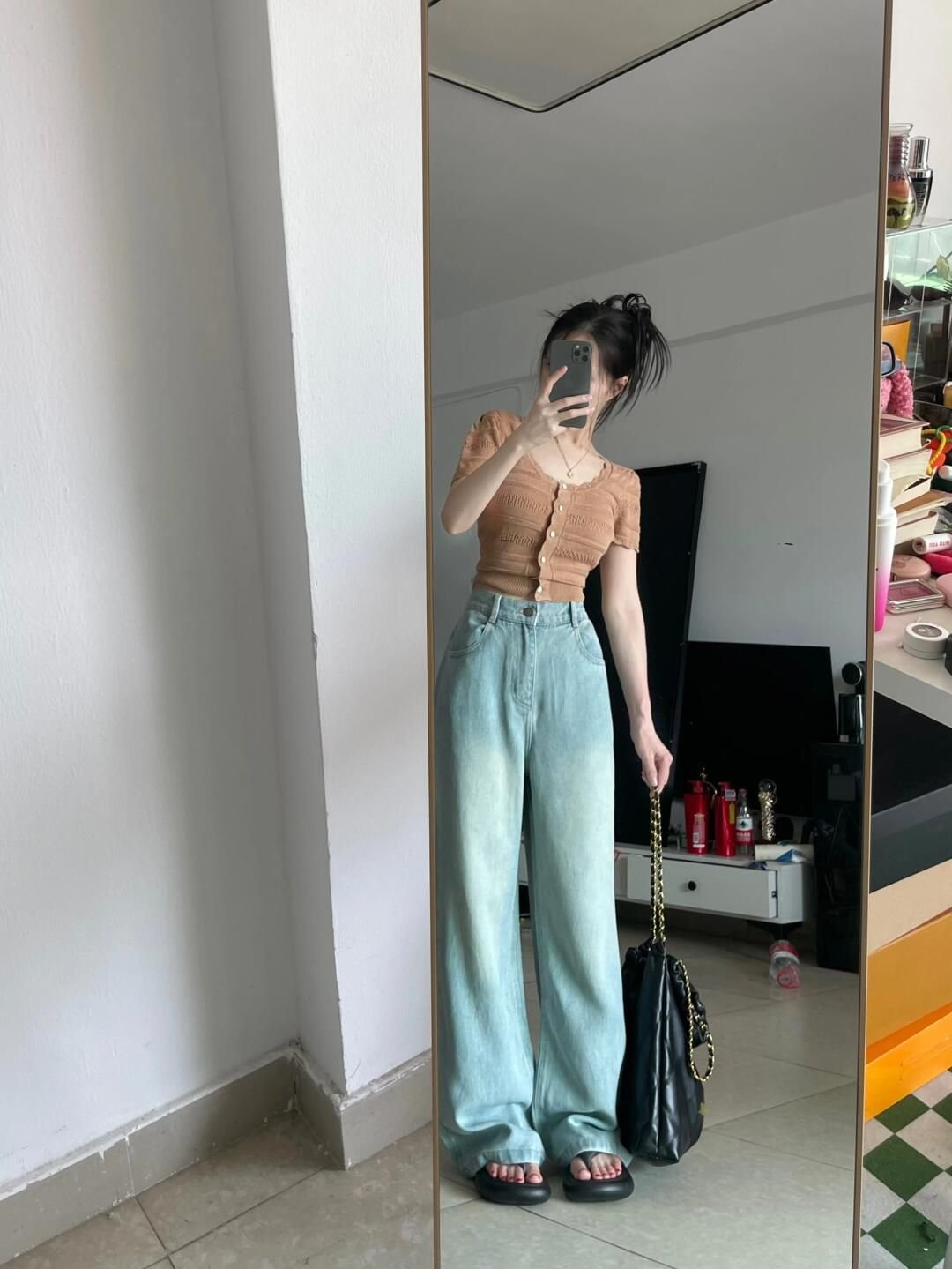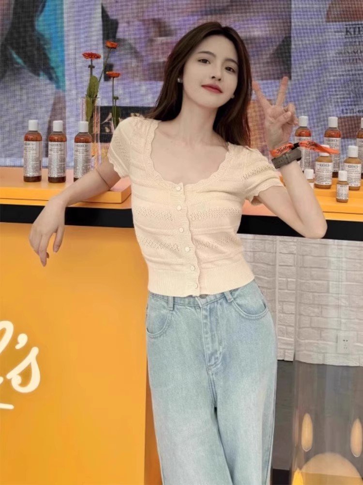 韩系杏色u领钩花短袖针织t恤女夏季小个子