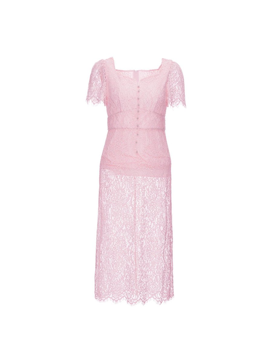 哥文花浅粉色蕾丝法式短袖连衣裙温柔系长裙
