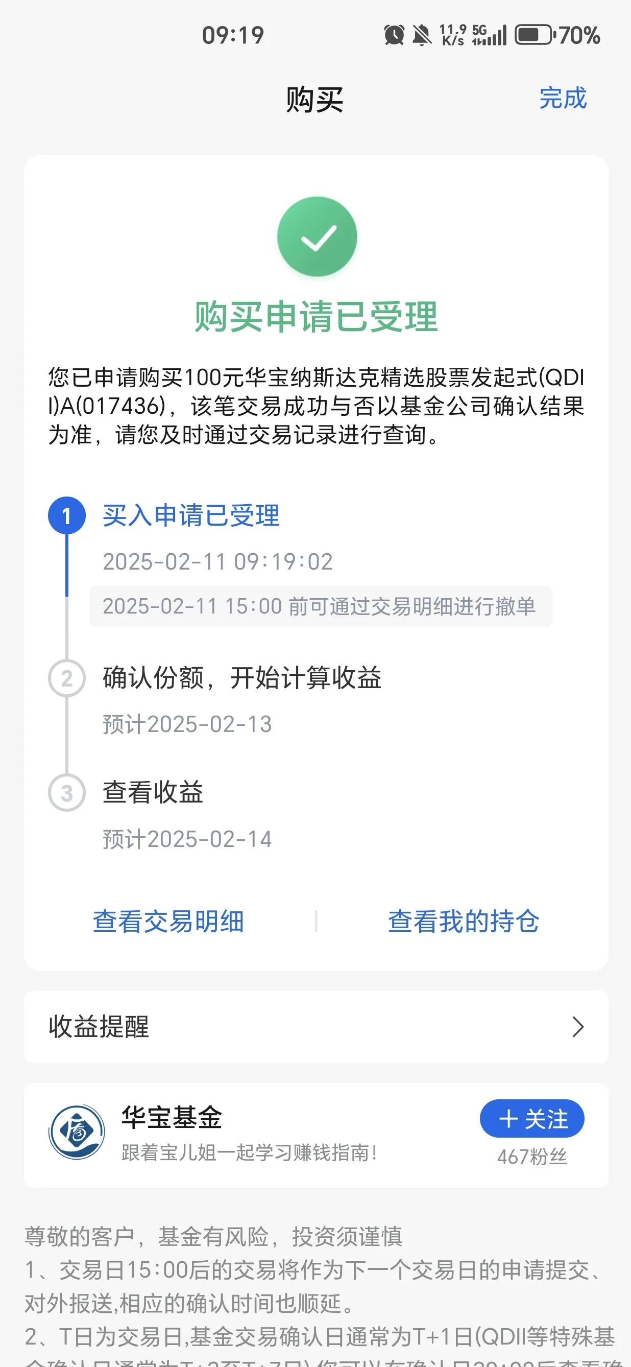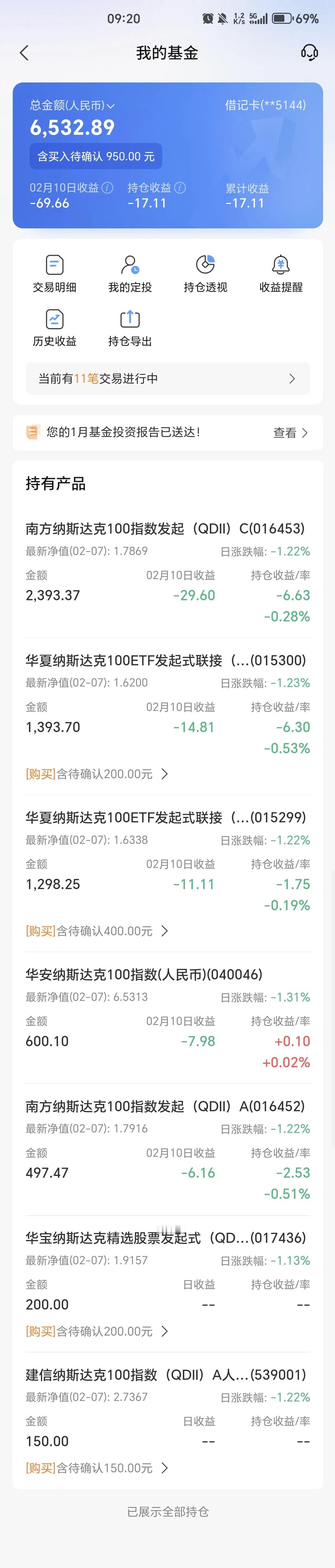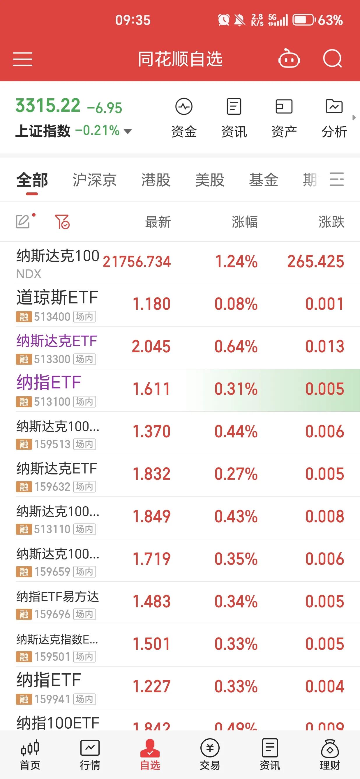 投资是唯一能让你在时间的洪流中奋起反击,并将不断减少的人力资本转化为生产性金融资本的方法。金融资本会让你在未来很长一段时间都有收益。 今日场外基金受周五晚上美股大跌影响,利润整体回撤1.2-1.3%,目前持有的华安纳斯达克指数基金、南方纳斯达克指数基金、华夏纳斯达克指数基金,整体与指数涨跌同步。因为场外基金采用T+2模式,因此收益更新晚2个交易日。 场内基金受昨夜上涨影响,整体上涨,但上涨不及预期,场内基金因为时时交易,受到很多因素影响产生溢价效应。目前整体溢价低于3%,是一个比较好的事情,如果后期溢价继续下跌,定投非常有利。避免了高溢价带来的利润损耗。 目前指数没有新高,场外基金继续加投。 另外如果场内基金溢价低于2%将暂停场外加仓,全部转入场内。