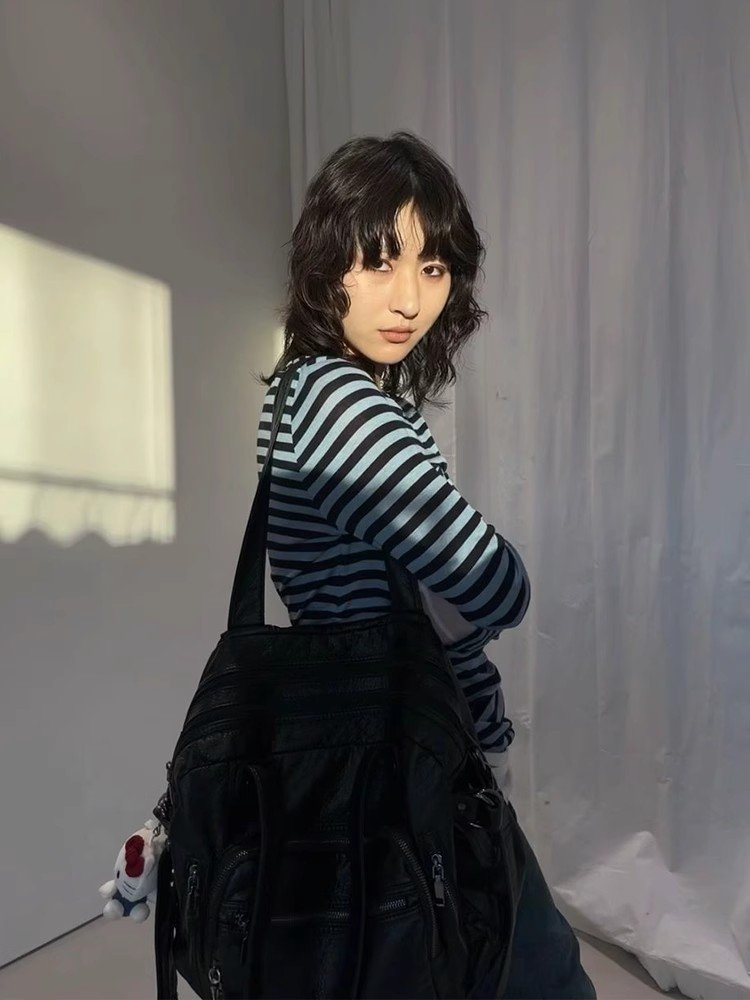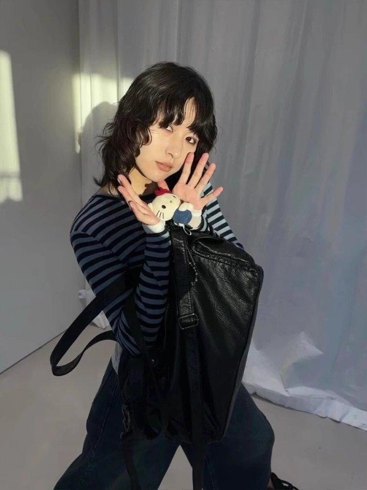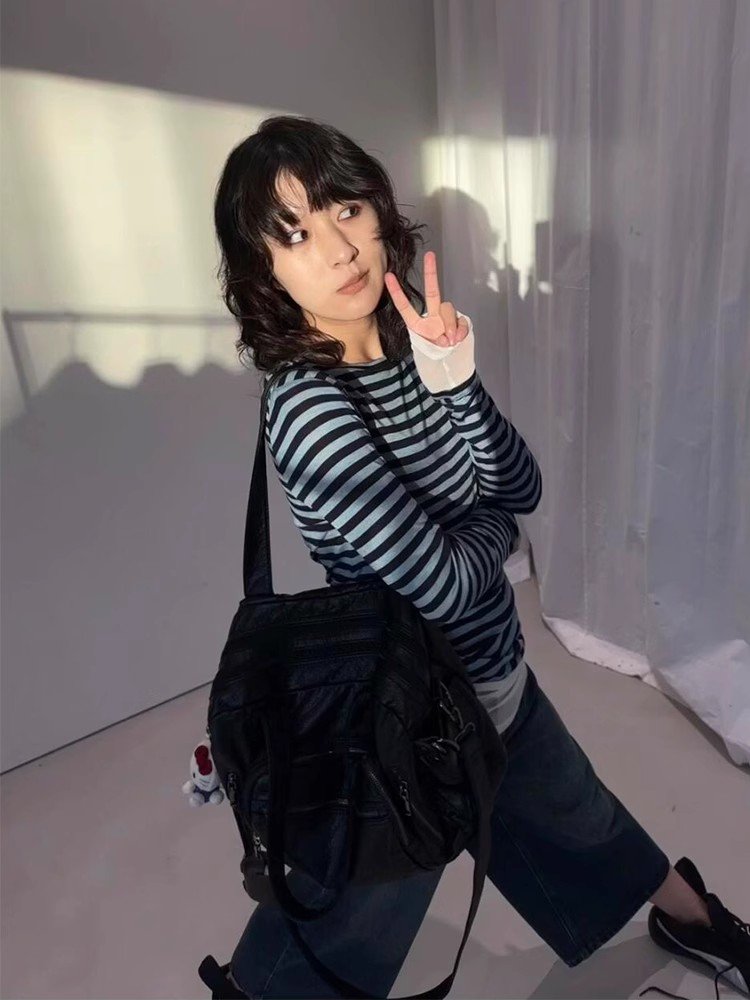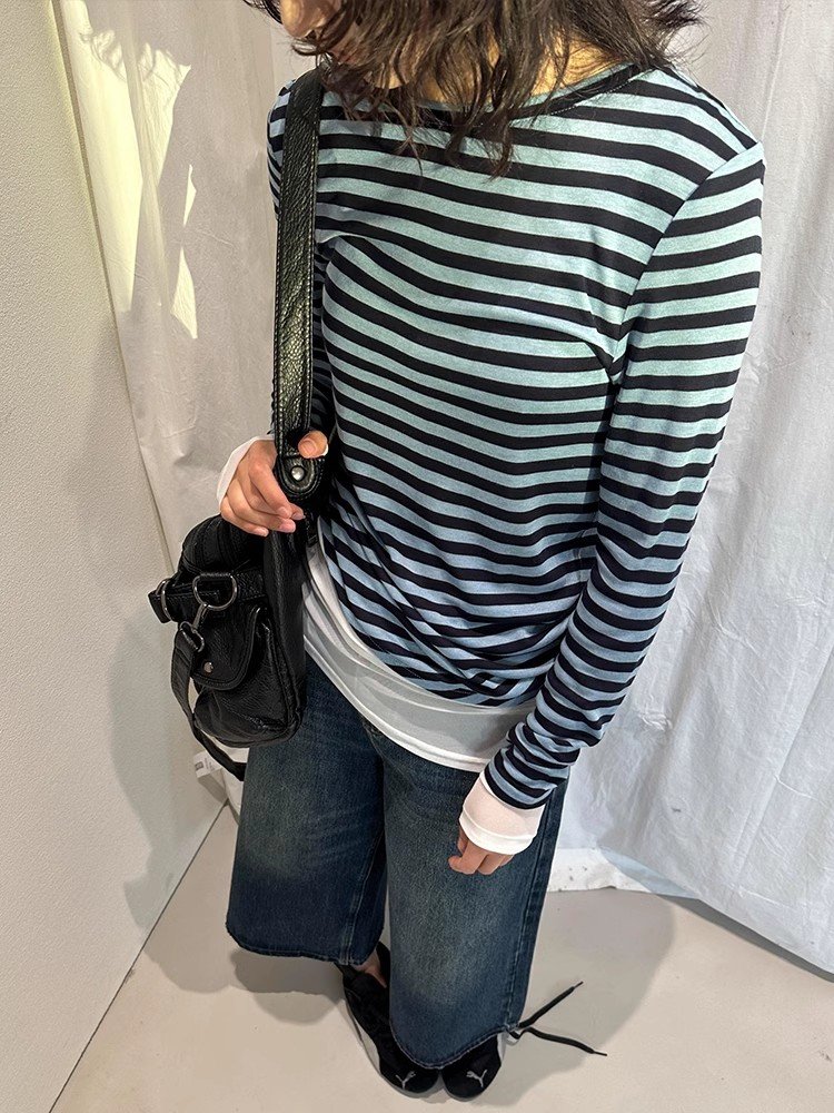 法式内搭灰色条纹圆领长袖t恤女早春宽松短
