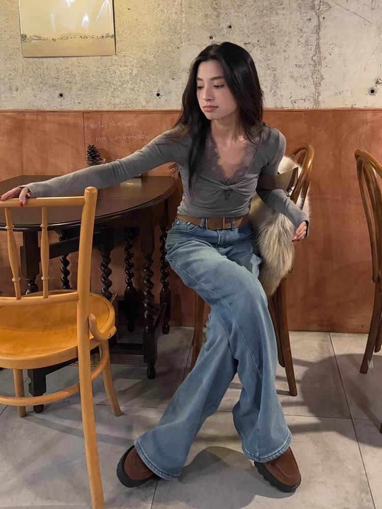 法式灰色扭结蕾丝拼接v领针织衫上衣女早春