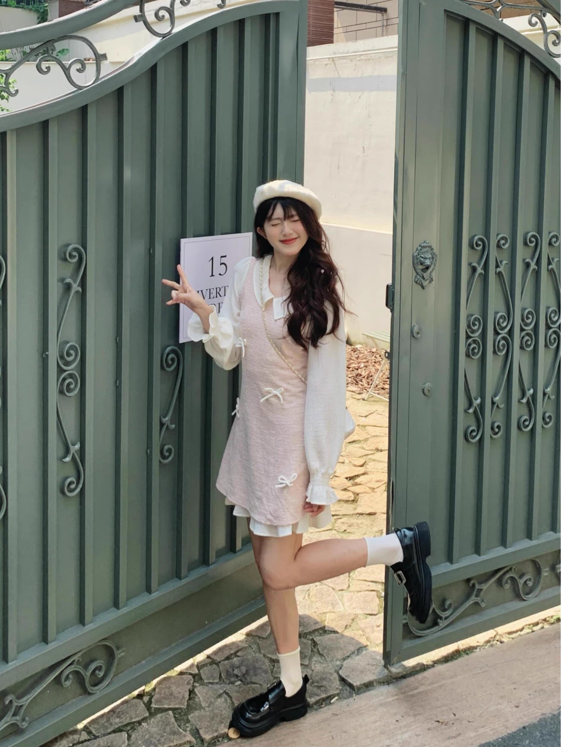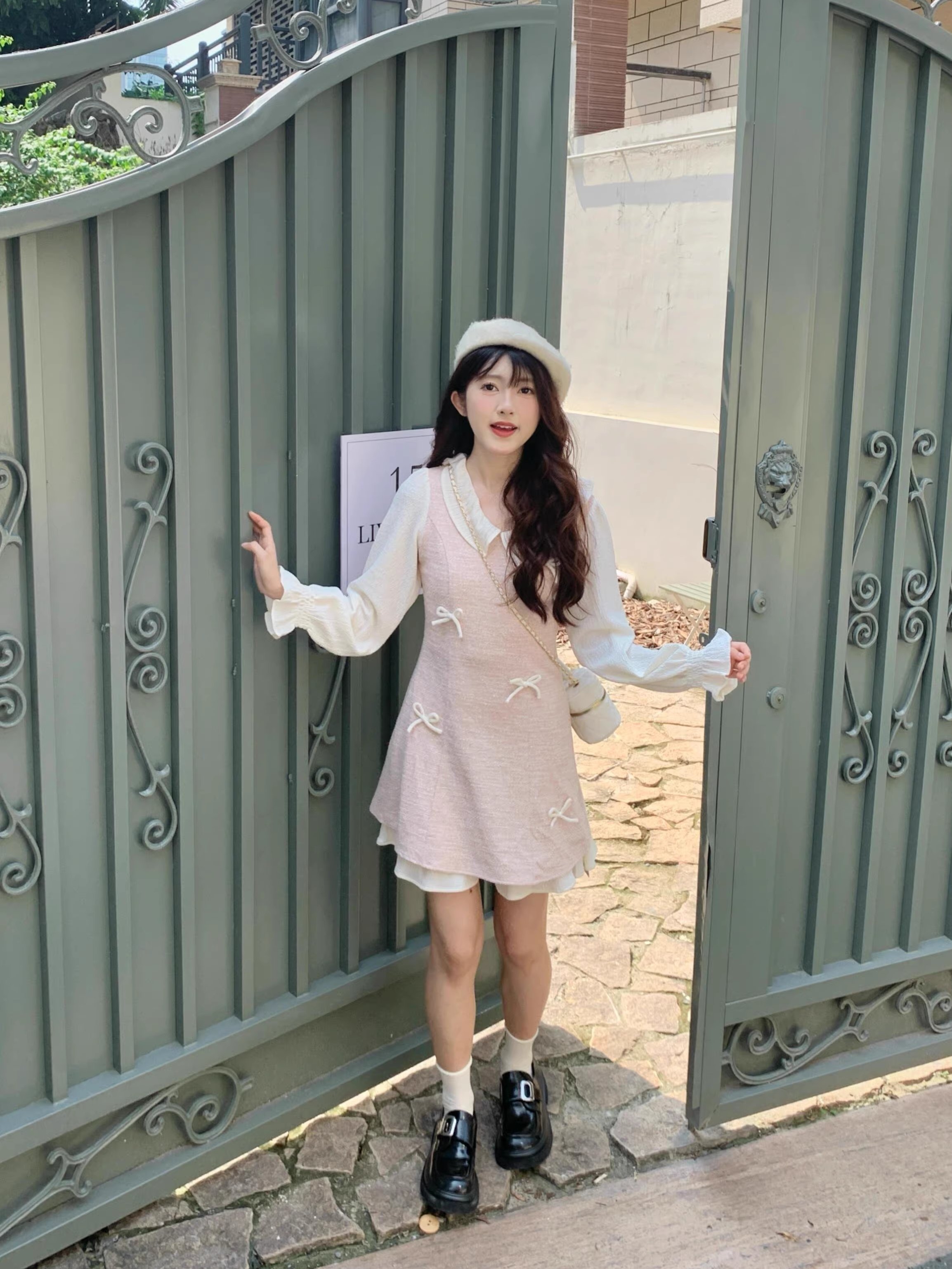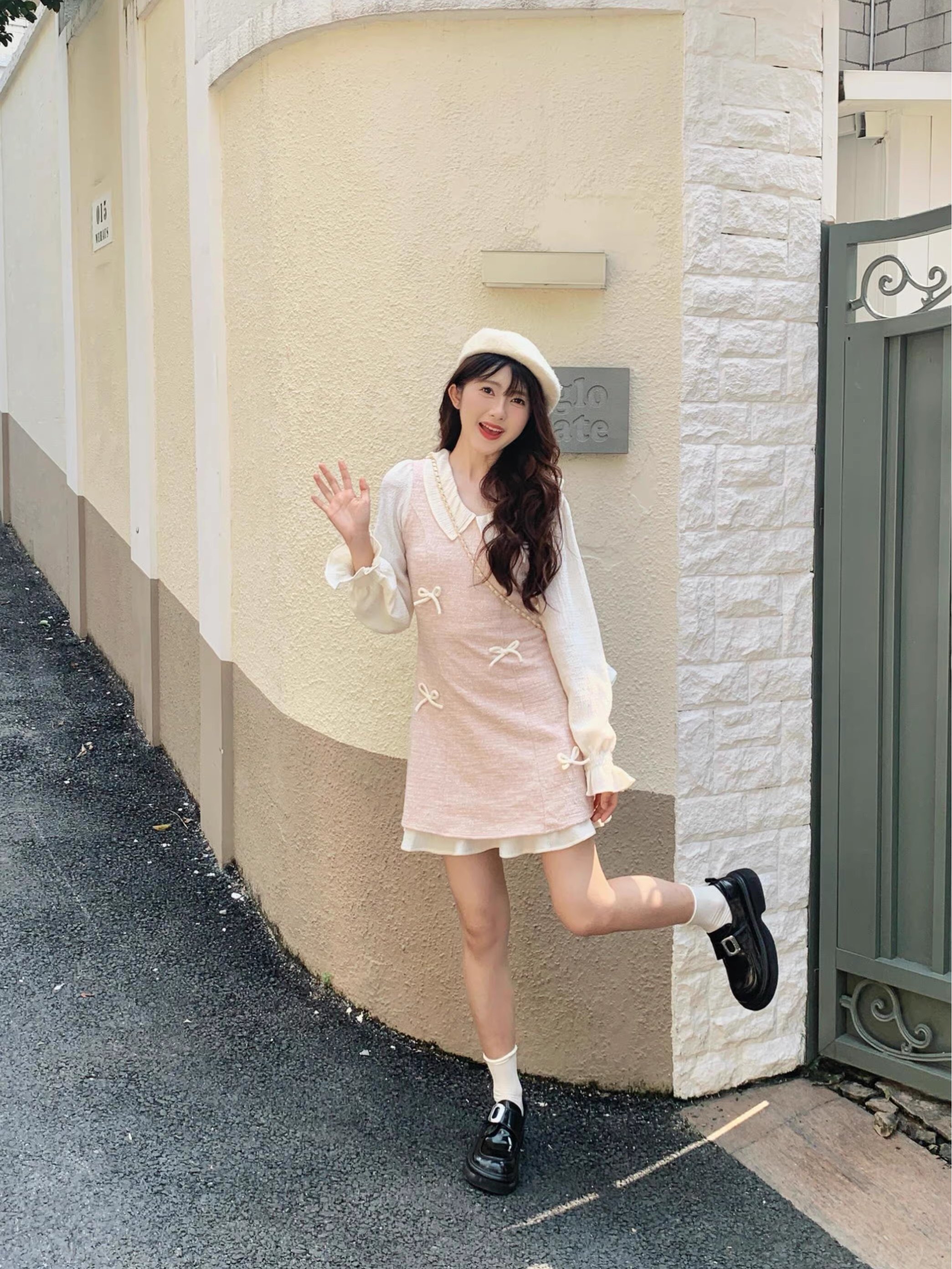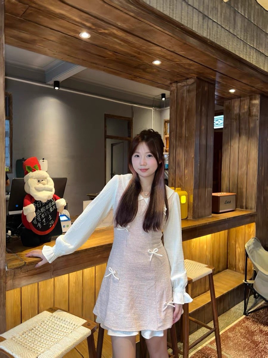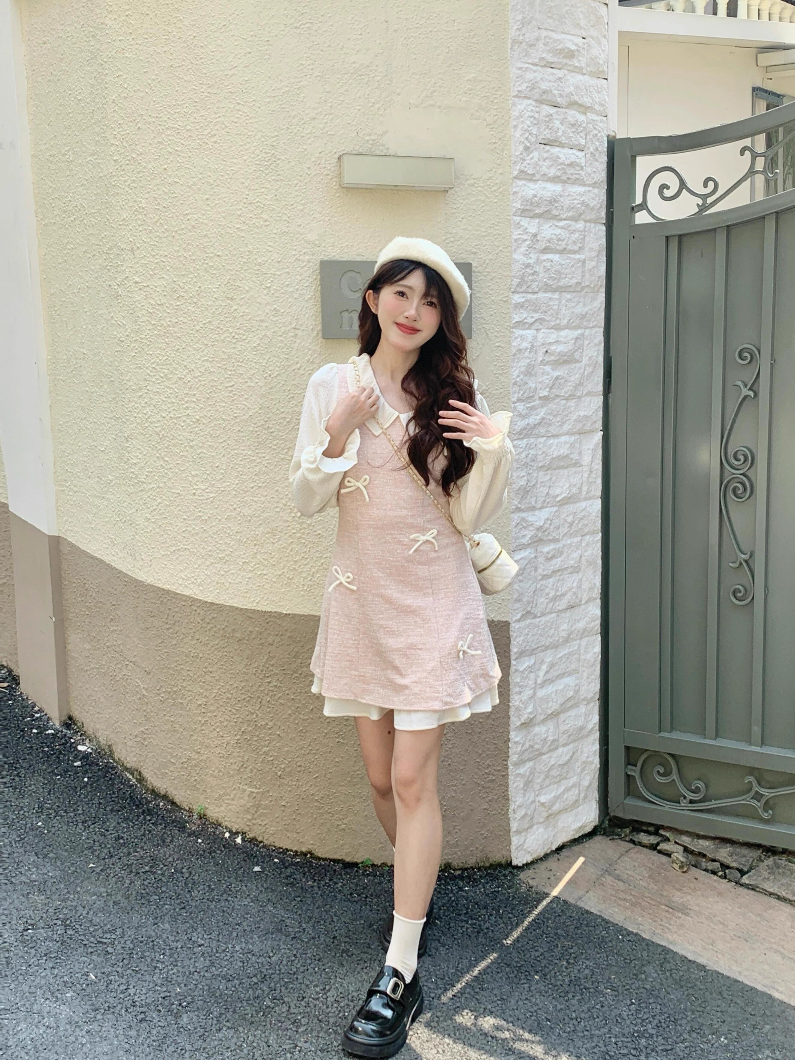 粉色假两件长袖连衣裙子2025开工早春秋穿搭新款女装法式夏季短裙