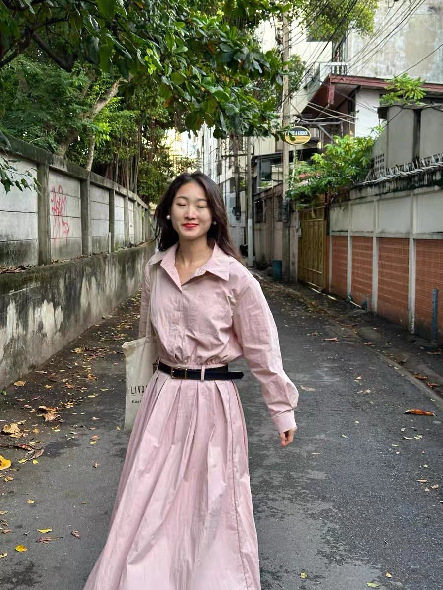 春季超火粉色衬衫长裙穿搭气质高级感