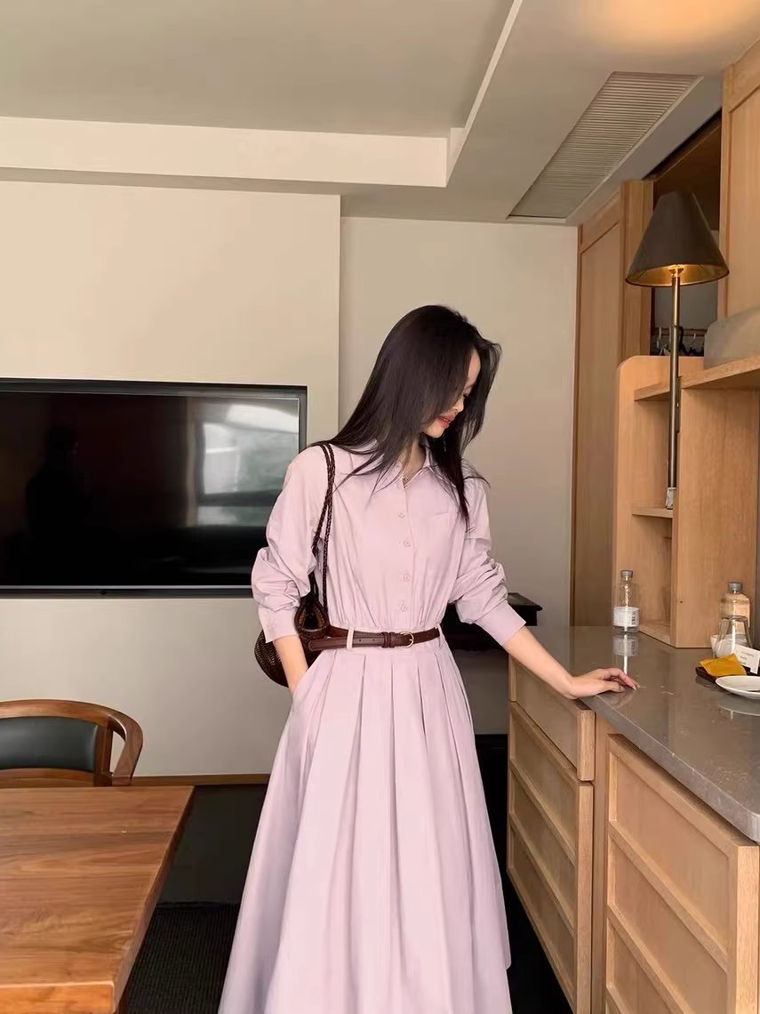 2025超火春季新款粉色polo领衬衫长袖连衣裙子女春装长裙开春穿搭