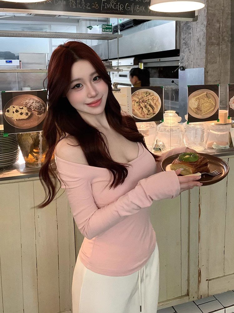 韩系内搭粉色大领口长袖t恤女早春修身紧身