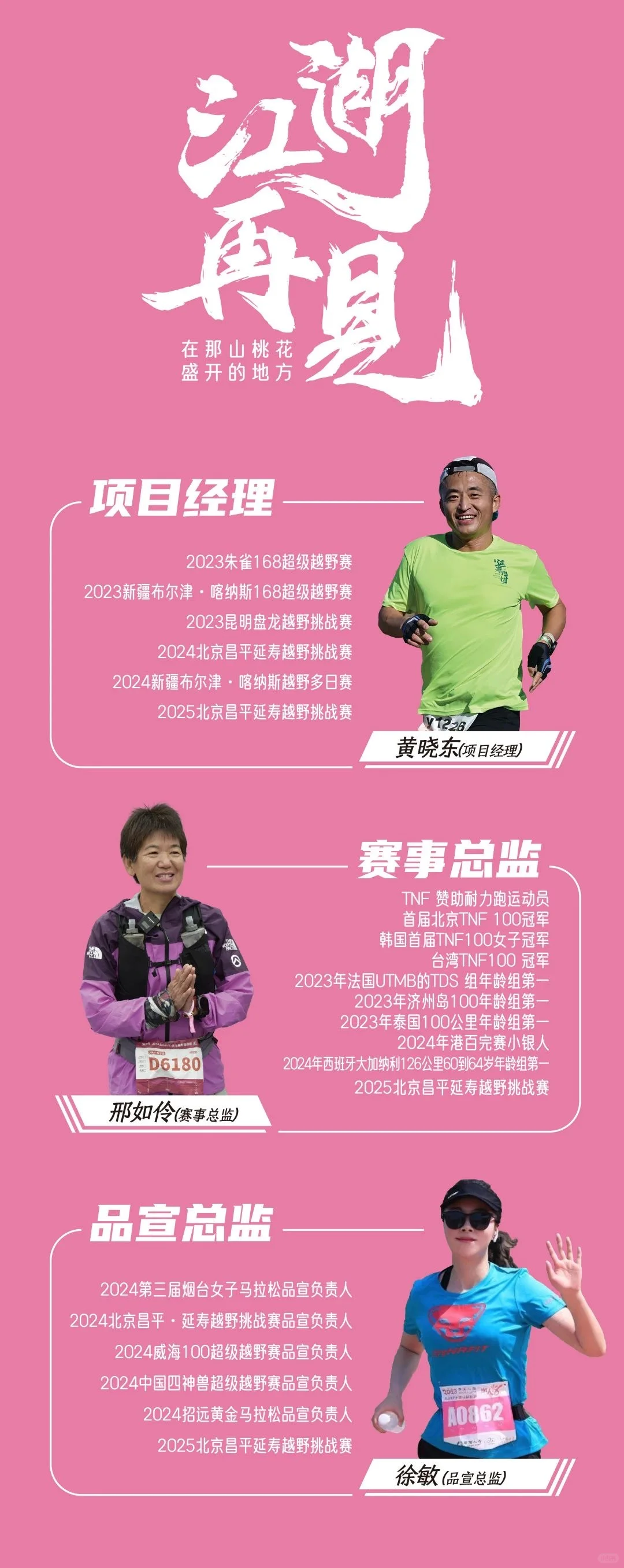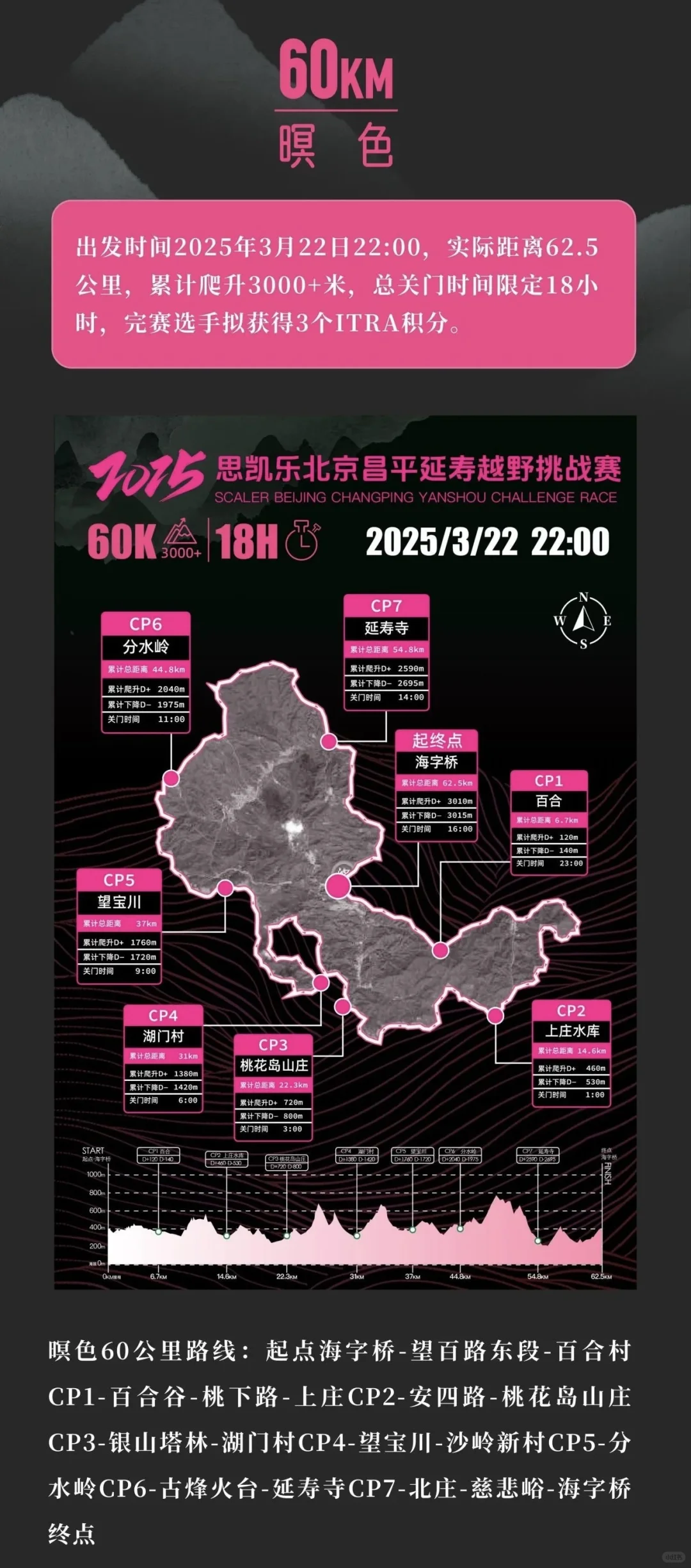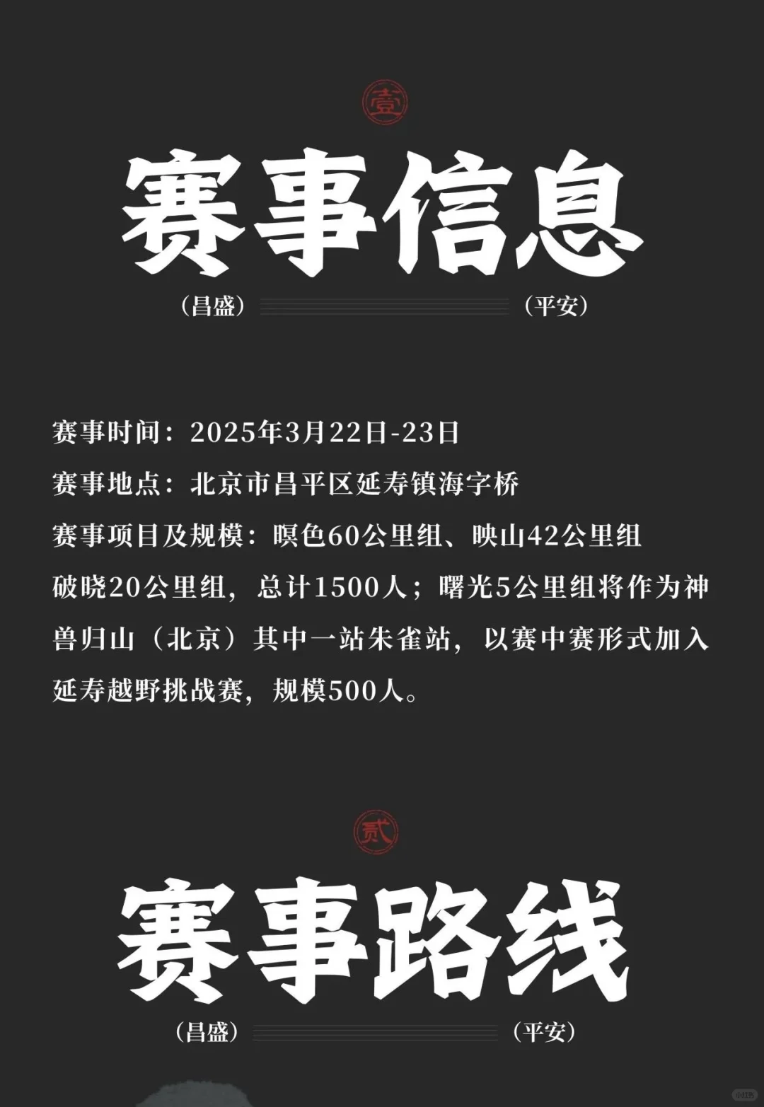 赛事时间:2025年3月22日-23日 赛事地点:北京市昌平区延寿镇海字桥 赛事项目及规模:总计1500人 瞑色60公里组 映山42公里组 破晓20公里组 曙光5公里组将作为神兽归山(北京)其中一站朱雀站,以赛中赛形式加入延寿越野挑战赛,规模500人。 团报将享受[九R][五R]折优惠, 参加团报请留言并后台si✉️