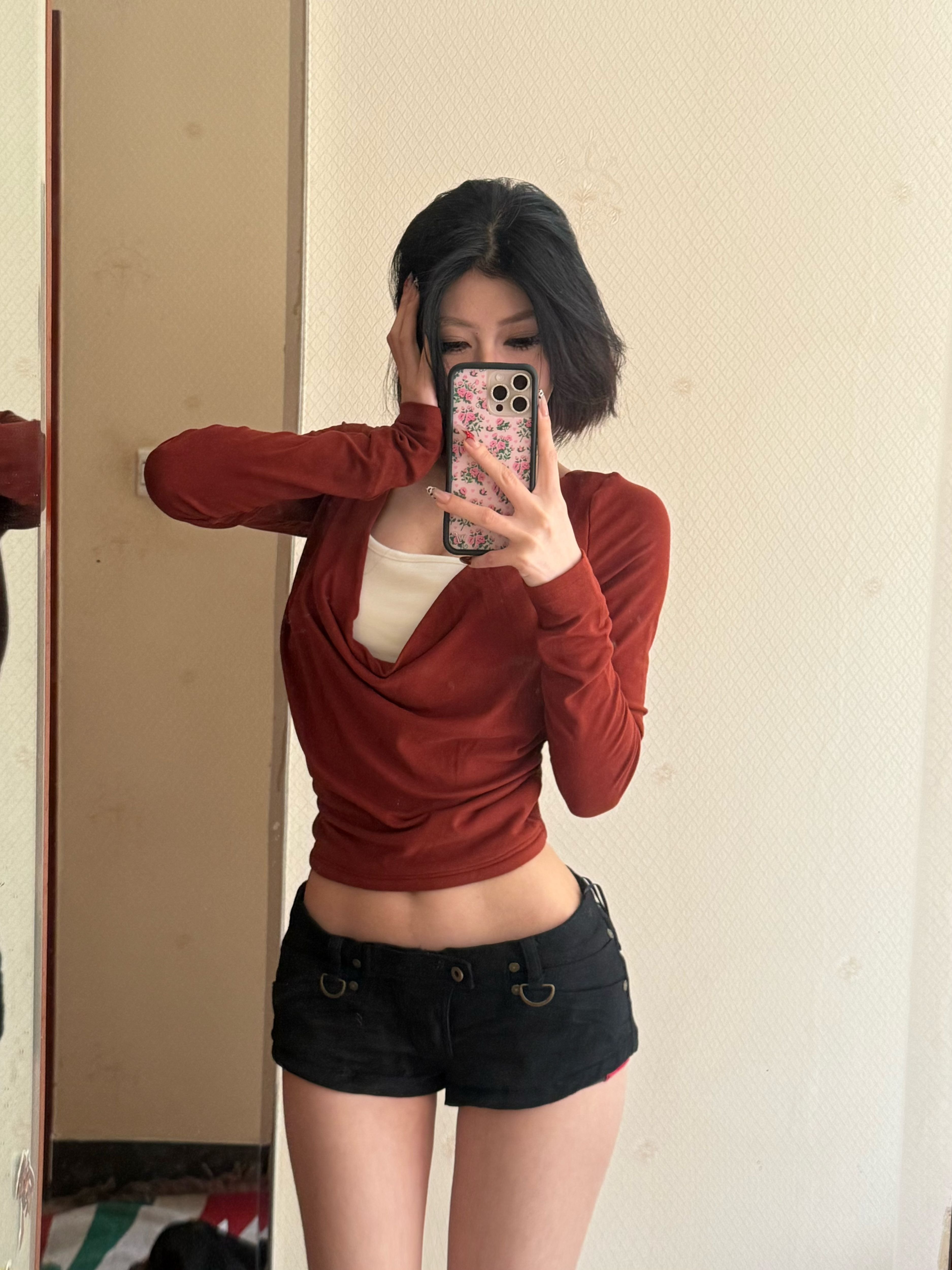 法式焦糖色荡领修身打底衫上衣女早春穿搭御
