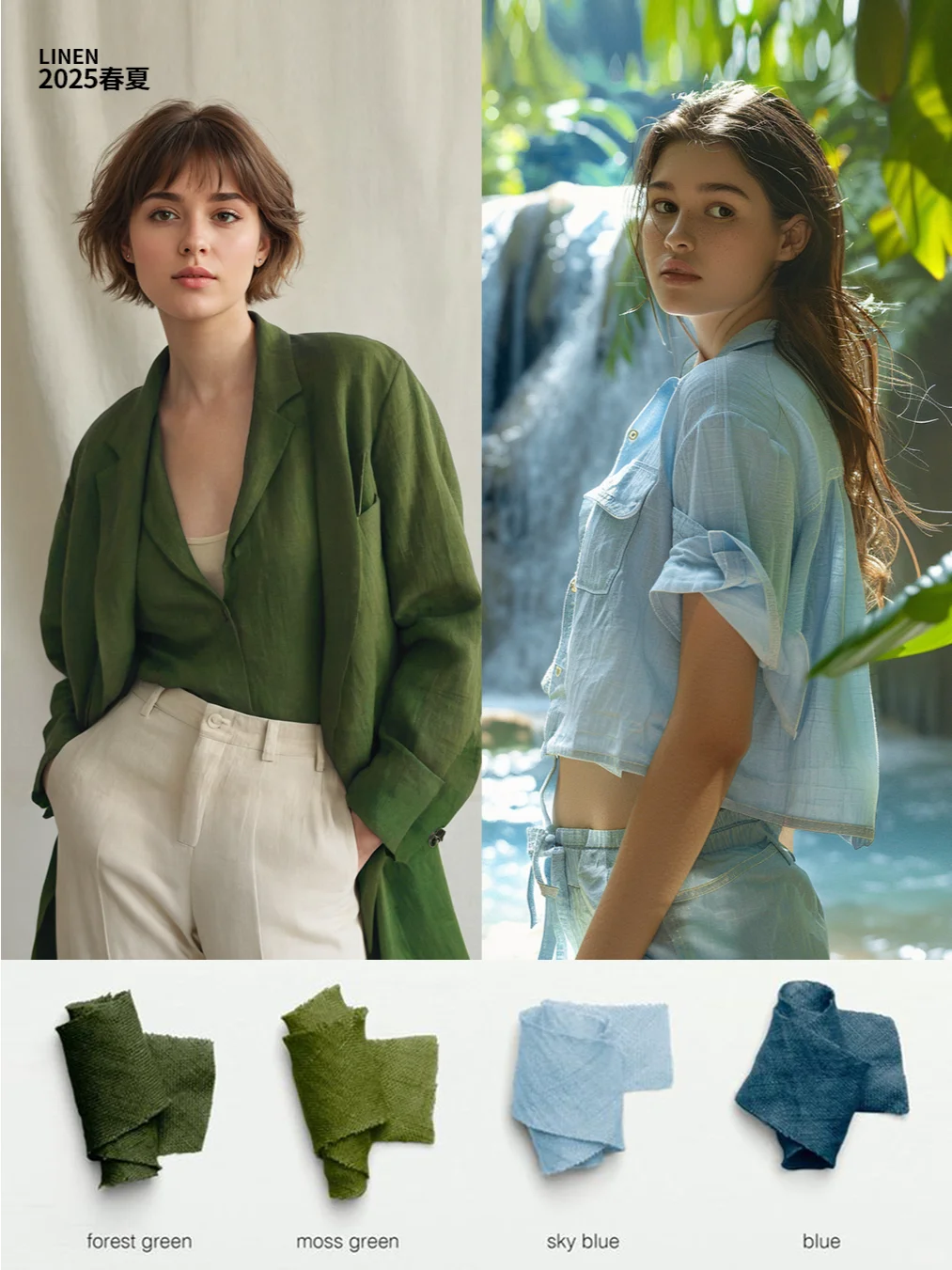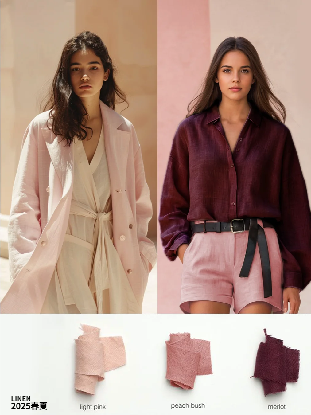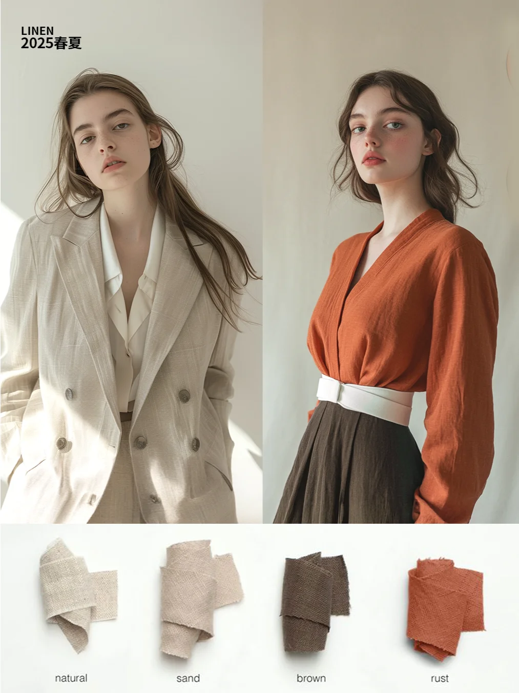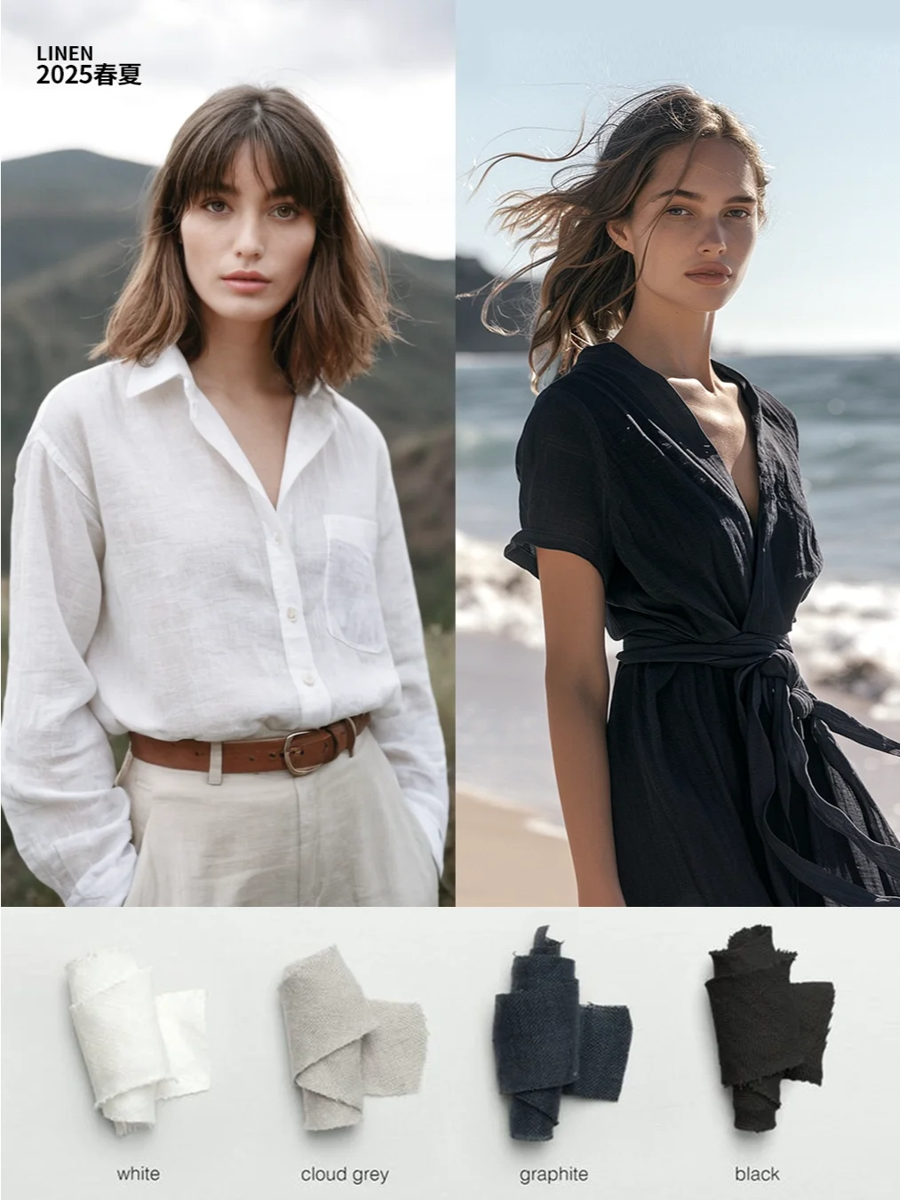 🌈 色彩方向: 淡雅多彩:高饱和亮色与低饱和中性色为辅,粉红系、蓝绿色系及色中的白色系与灰色系呈上升趋势。 趋势色彩:提取10个趋势色彩,分别为适合上衣、外套的色彩,衬衫、套装和连衣裙的中层色以及裤装和半裙的色彩。 亚麻 春夏亚麻 亚麻面料 亚麻趋势 麻之语 亚麻布料 2025春夏 2025春夏新款布料