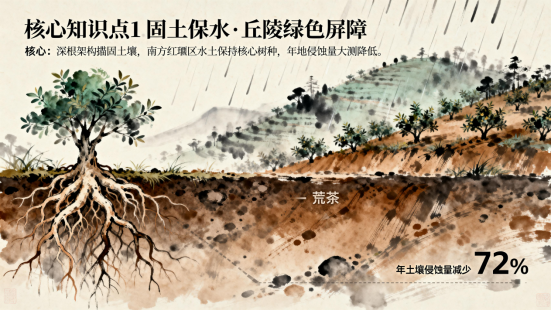 油茶树主根深达3–5米,侧根横向延伸超10米,形成庞大地下网络。这种深根性结构能有效锚固土壤,防止雨水冲刷。江西省水土保持科学研究所实测数据显示:种植油茶的坡地,年土壤侵蚀量比荒坡减少72%,比种植玉米等一年生作物的坡地减少58%。在南方红壤区——我国水土流失最严重的区域之一——油茶林被广泛用于生态修复,被称为“站着的水库”。