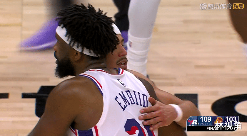 憾负!布克21+2+9,格林8+3+3,赛后布克走过去,抱住恩比德