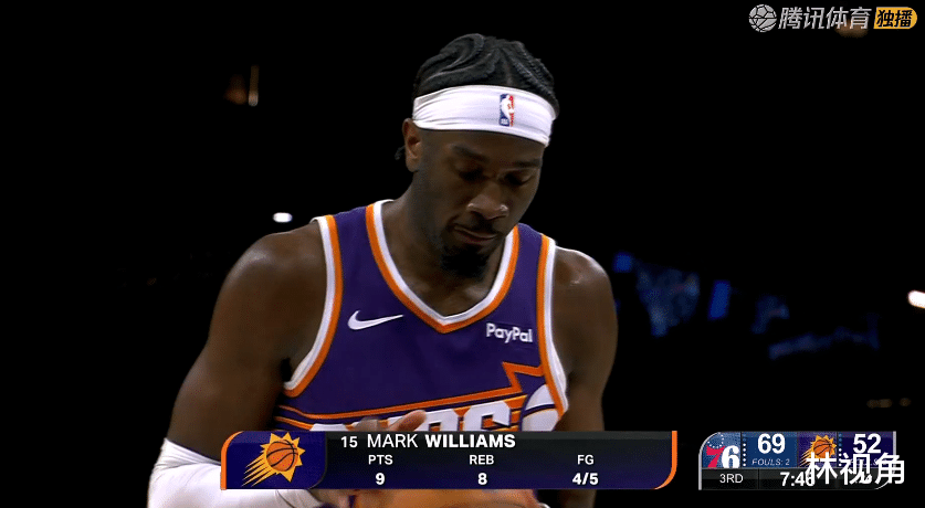 布克这时候终于命中一记三分,7中1,就是开张有些晚了,马克西三分命中,布克连续造杀伤罚球,帮助球队一直保持着微弱悬念。