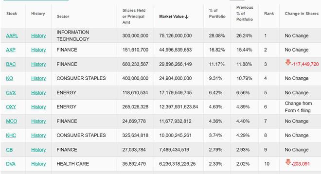不过,美银仍是伯克希尔的第三大重仓股。重仓股的前十位排名和三季度完全相同,前两名依然是苹果(AAPL)和美国运通(AXP),第四到第十位分别是可口可乐(KO)、雪佛龙(CVX)、西方石油(OXY)、穆迪(MCO)、卡夫亨氏(KHC)、安达保险(CB)以及德维特(DVA)。