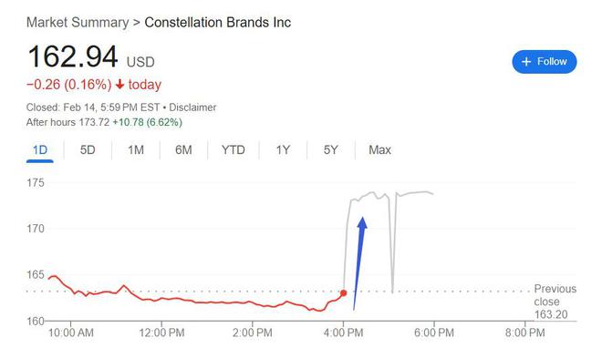 伯克希尔持仓披露后,周五盘后,收跌近0.2%的ConstellationBrands股价跳涨超6%。