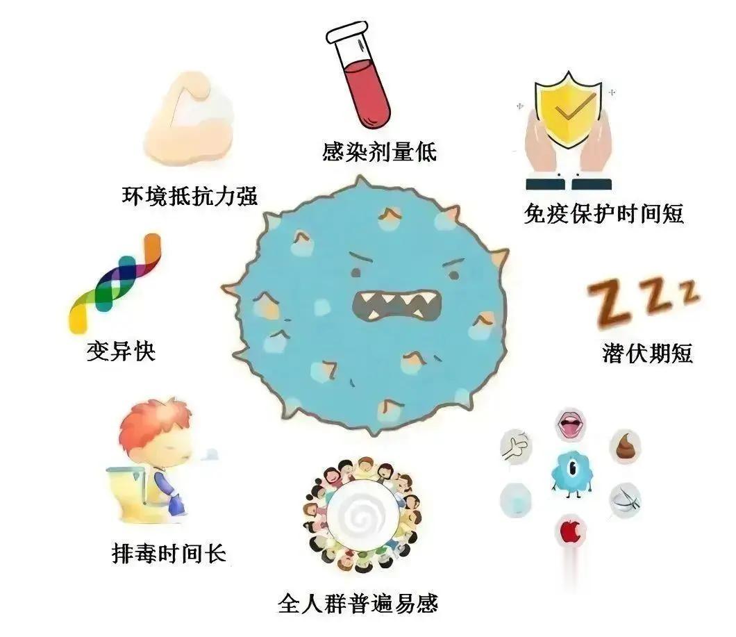 诺如病毒具有全人群普遍易感、感染剂量低(低至18个病毒颗粒即可引起感染)、感染后潜伏期短(通常24—48小时)、排毒时间长(排毒高峰在发病后2—5天,持续约2—3周)、外环境抵抗力强(可在0—60℃温度范围内存活)、免疫保护时间短(感染后免疫保护持续6—24个月,同一个体可重复感染同一毒株或不同毒株的诺如病毒)等特点。