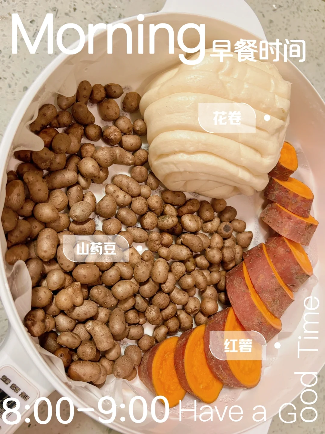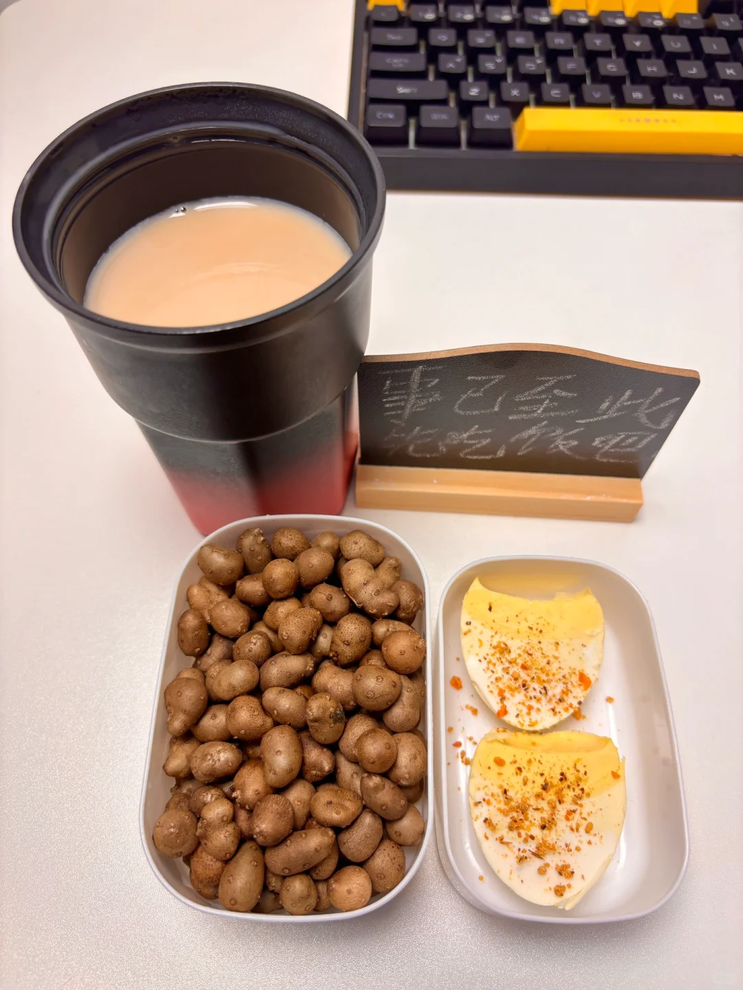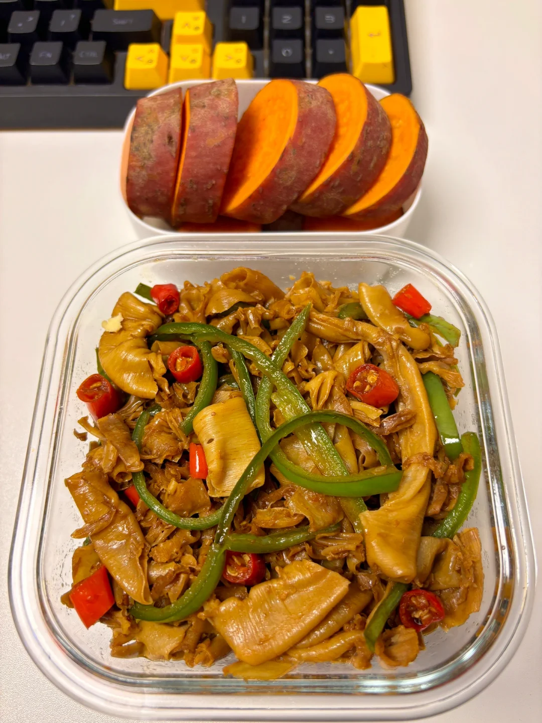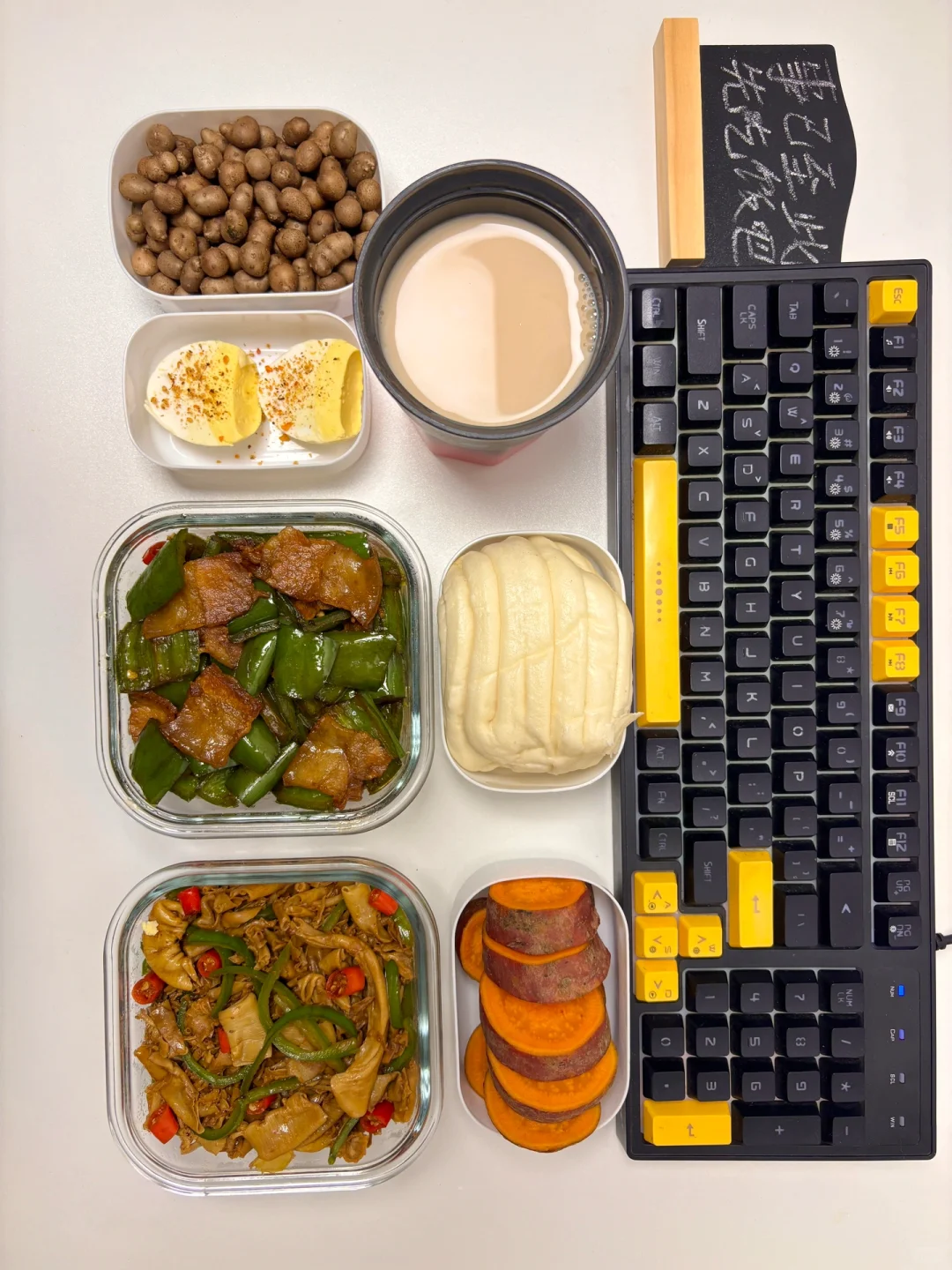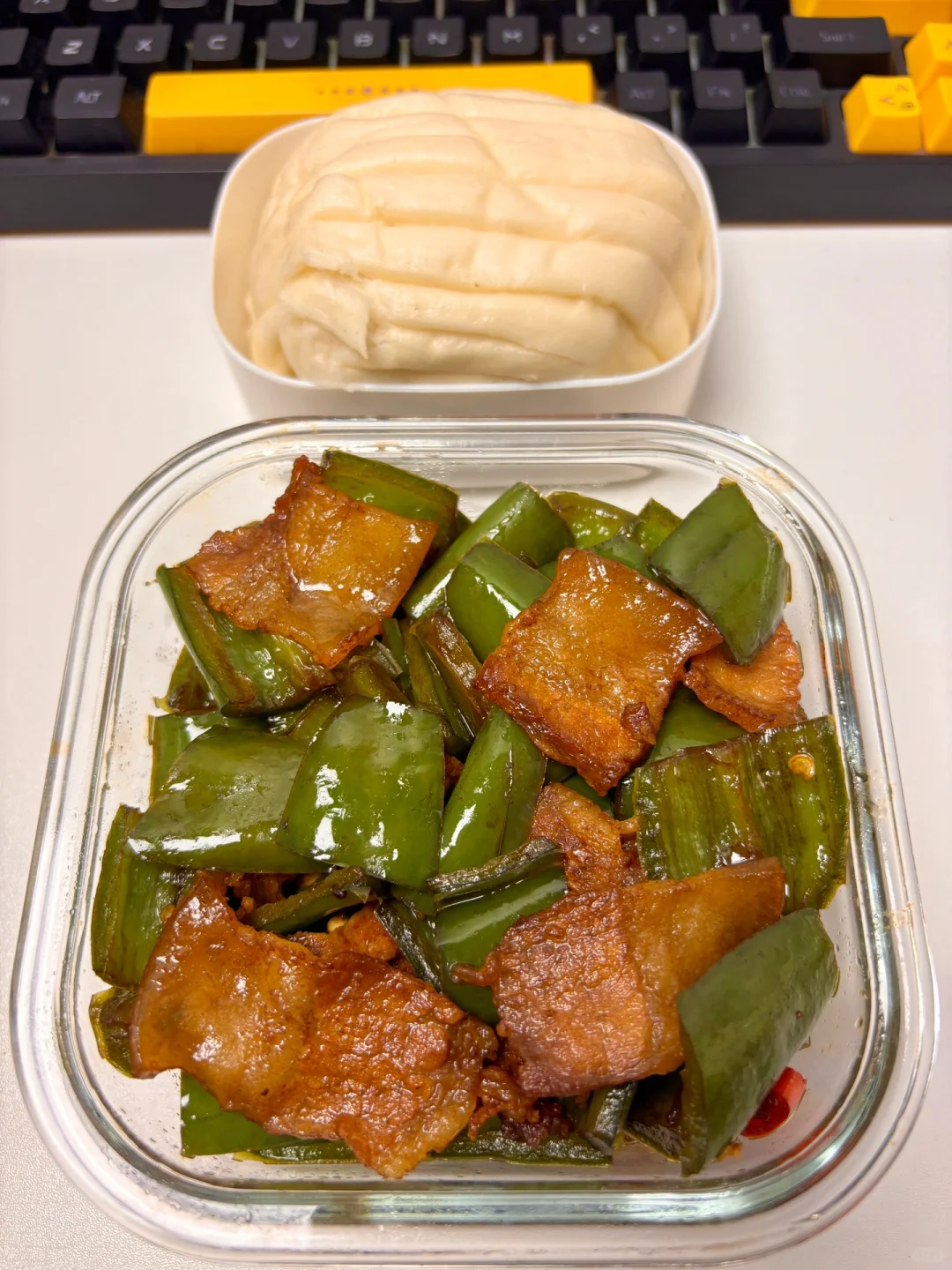 肉直接放两份! 1⃣️早:山药豆、实蛋、牛奶黑咖(3💰) 2⃣️中:辣椒炒肉、花卷(5.6💰) 3⃣️晚:炒碎肠、红薯(0.8💰) 肉线下买的17一斤,用量约4💰 碎肠老家寄的0💰 合计:9.4💰