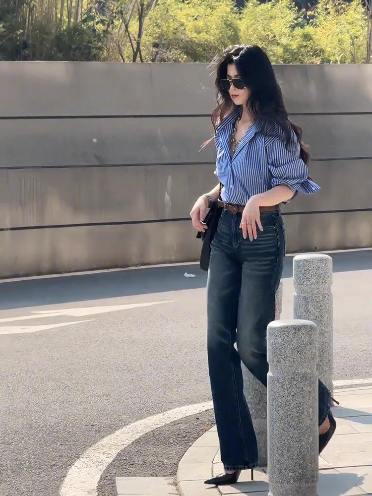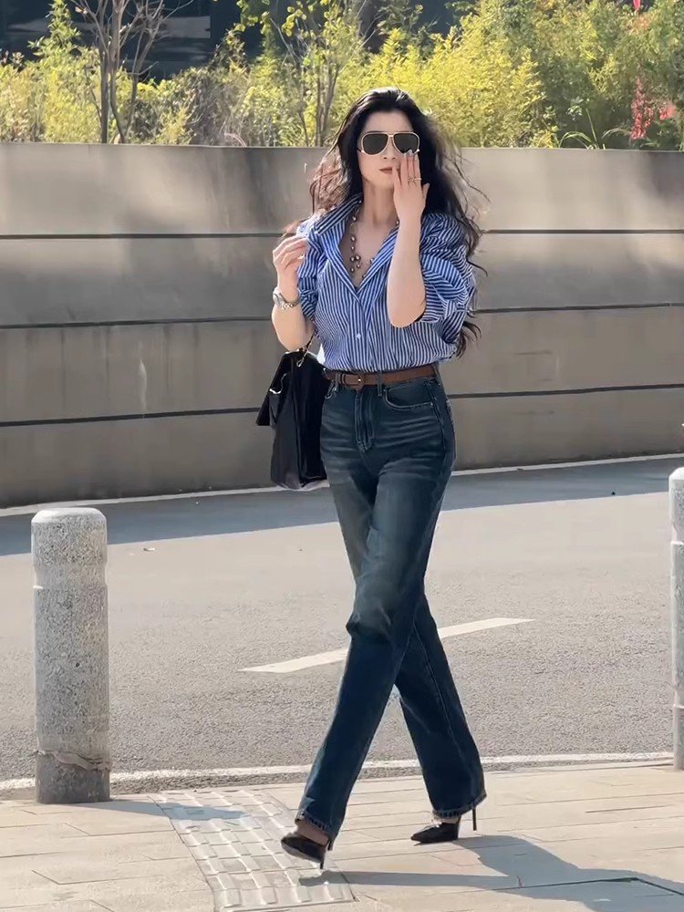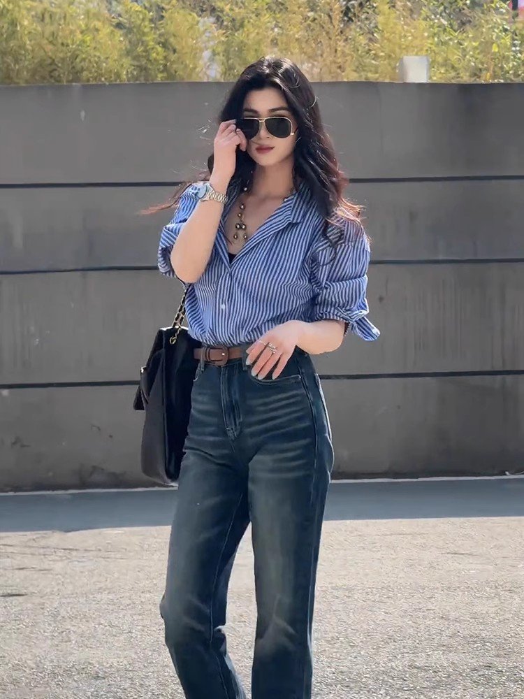 韩系蓝色条纹polo领长袖衬衫外套女早春